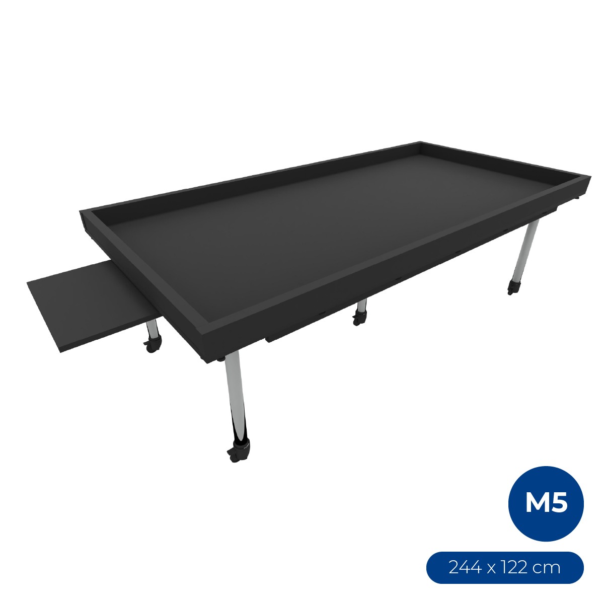 Tavolo 244x122cm per robotica, di forma rettangolare, completo di gambe ad altezza M5 con ruote, altezza al piano 70,3cm. Materiale: piano in truciolare rivestito in melamina nera opaca, gambe in metallo verniciato colore nero opaco. Le spondine fissate al piano sono facilmente smontabili e riponibili nella parte sottostante al piano per esser utilizzato per altre attività STEAM. Le dimensioni devono esser conformi alle specifiche dei campi da gara delle competizioni di robotica educativa di FIRST LEGO League e MakeX. Il tavolo è dotato inoltre di due mensole a scomparsa su cui riporre tablet e strumenti esterni al campo da gara. Prodotto consegnato premontato con 5gambe da avvitare al piano.