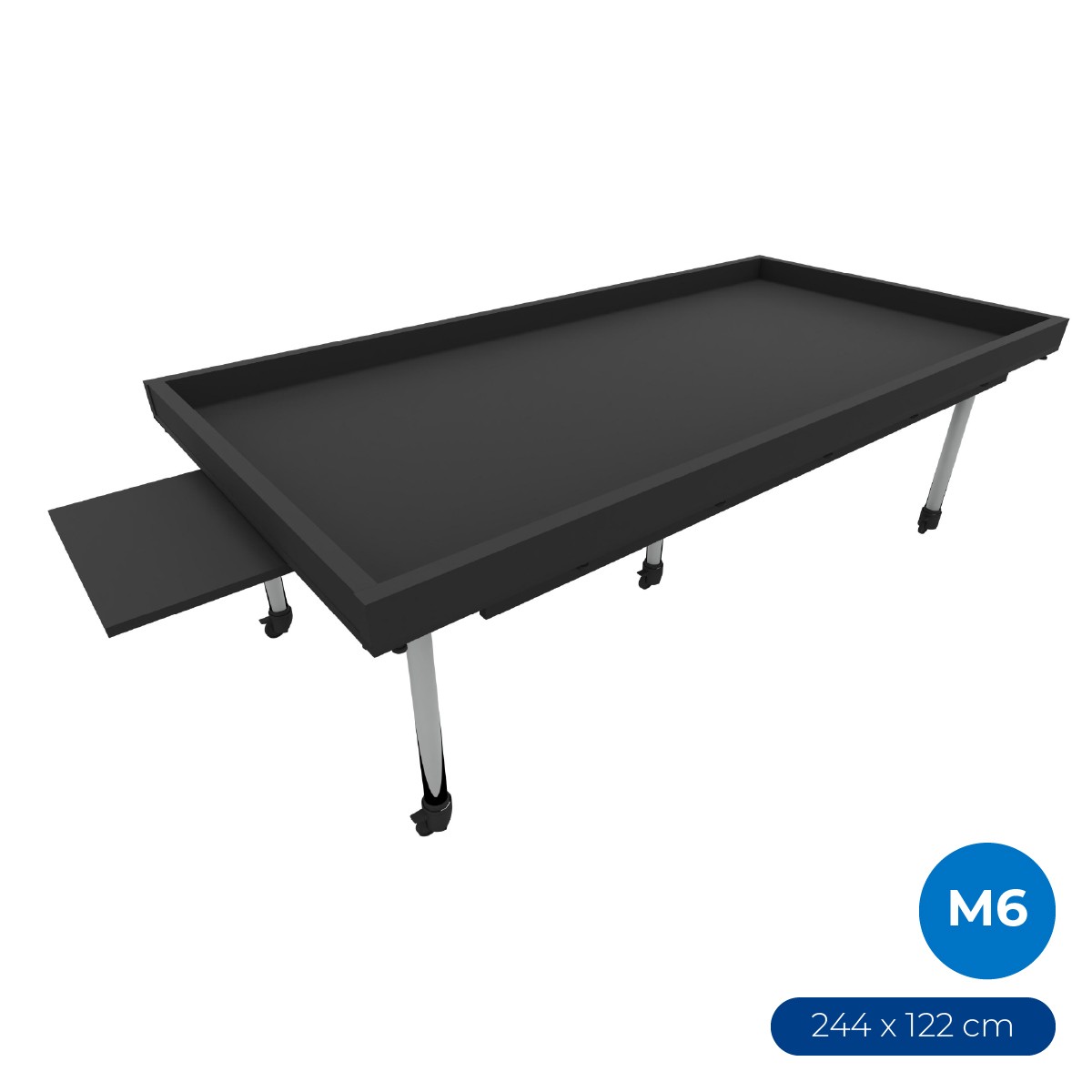 Tavolo 244x122cm per robotica, di forma rettangolare, completo di gambe ad altezza M6 con ruote, altezza al piano 76,3cm. Materiale: piano in truciolare rivestito in melamina nera opaca, gambe in metallo verniciato colore nero opaco. Le spondine fissate al piano sono facilmente smontabili e riponibili nella parte sottostante al piano per esser utilizzato per altre attività STEAM. Le dimensioni devono esser conformi alle specifiche dei campi da gara delle competizioni di robotica educativa di FIRST LEGO League e MakeX. Il tavolo è dotato inoltre di due mensole a scomparsa su cui riporre tablet e strumenti esterni al campo da gara. Prodotto consegnato premontato con 5gambe da avvitare al piano.