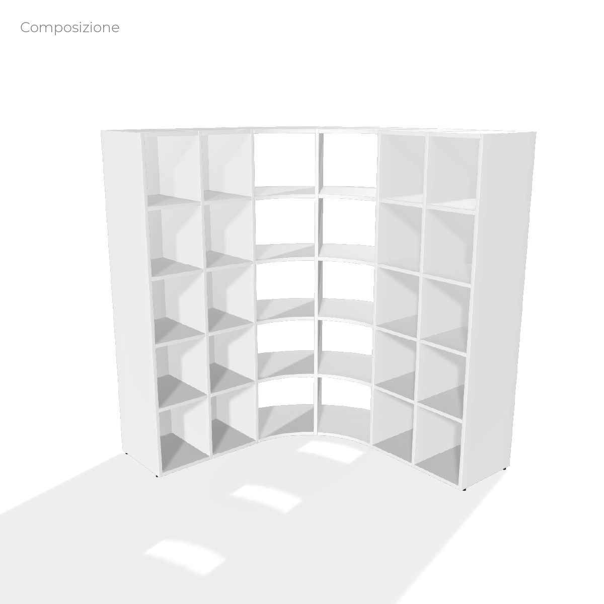Componenti: 4 Moduli Rettangolari Larghi con Fondo e 2 Moduli Curvi ciascuno con 4 Mensole