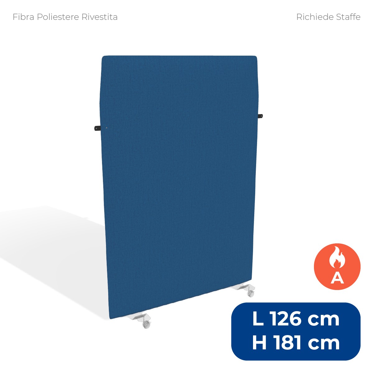 Pannello divisorio da pavimento ad alta capacità fonoassorbente, ideale per migliorare l'acustica e garantire privacy negli ambienti lavorativi o pubblici. Misura 126xH181 cm con uno spessore di 4 cm ed è dotato di una struttura interna in metallo e imbottitura in fibra di poliestere ignifuga (classe 1), ad alto assorbimento acustico. Il rivestimento sfoderabile in tessuto ignifugo (classe 1), nel colore blu chiaro tipo "A", è completato da una pratica cinghietta con bottone automatico. Le staffe per il fissaggio a pavimento sono da acquistare separatamente.