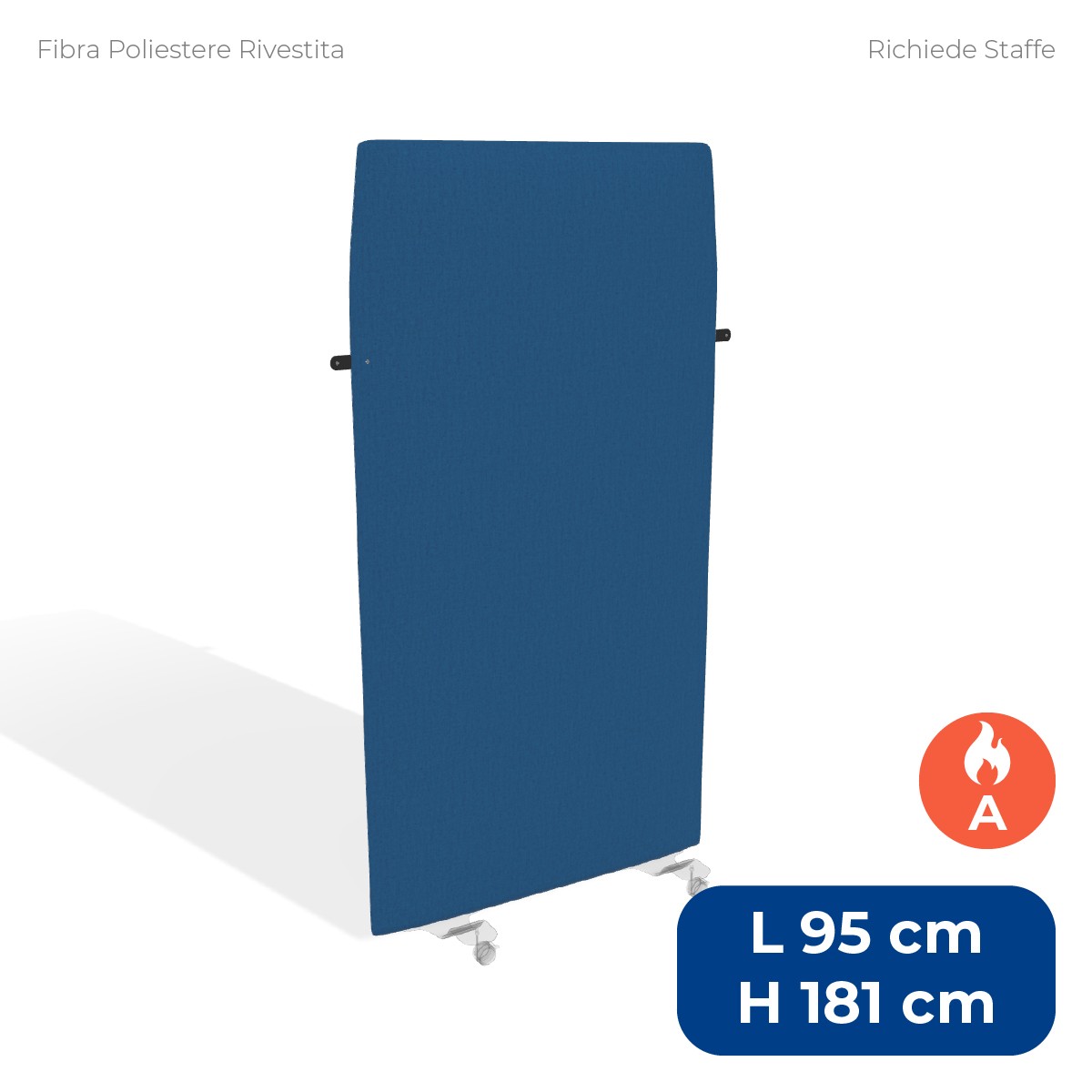 Pannello divisorio da pavimento ad alta capacità fonoassorbente, ideale per migliorare l'acustica e garantire privacy negli ambienti lavorativi o pubblici. Misura 95xH181 cm con uno spessore di 4 cm ed è dotato di una struttura interna in metallo e imbottitura in fibra di poliestere ignifuga (classe 1), ad alto assorbimento acustico. Il rivestimento sfoderabile in tessuto ignifugo (classe 1), nel colore blu chiaro tipo "A", è completato da una pratica cinghietta con bottone automatico. Le staffe per il fissaggio a pavimento sono da acquistare separatamente.