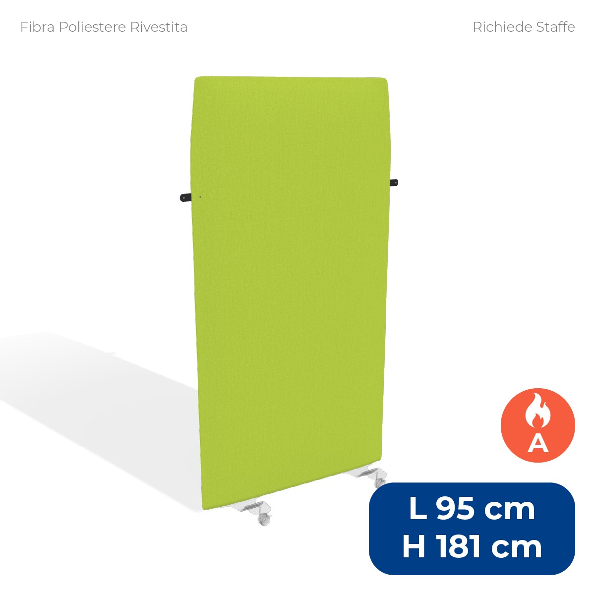 Pannello divisorio da pavimento ad alta capacità fonoassorbente, ideale per migliorare l'acustica e garantire privacy negli ambienti lavorativi o pubblici. Misura 95xH181 cm con uno spessore di 4 cm ed è dotato di una struttura interna in metallo e imbottitura in fibra di poliestere ignifuga (classe 1), ad alto assorbimento acustico. Il rivestimento sfoderabile in tessuto ignifugo (classe 1), nel colore verde tipo "A", è completato da una pratica cinghietta con bottone automatico. Le staffe per il fissaggio a pavimento sono da acquistare separatamente.