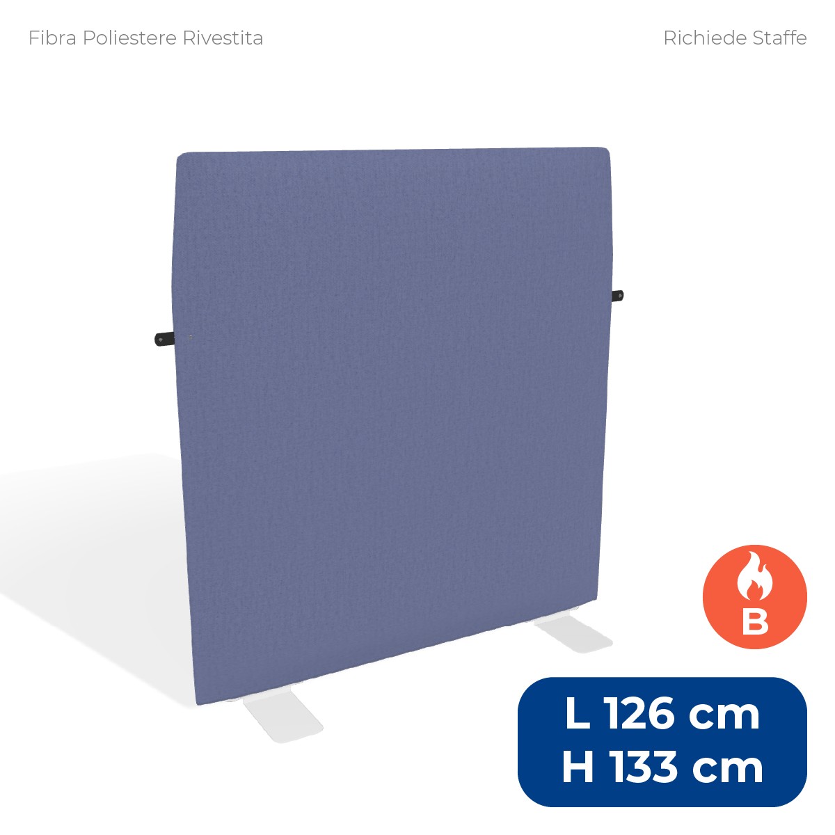 Pannello divisorio da pavimento ad alta capacità fonoassorbente, ideale per migliorare l'acustica e garantire privacy negli ambienti lavorativi o pubblici. Misura 126xH133 cm con uno spessore di 4 cm ed è dotato di una struttura interna in metallo e imbottitura in fibra di poliestere ignifuga (classe 1), ad alto assorbimento acustico. Il rivestimento sfoderabile in tessuto ignifugo (classe 1), nel colore lilla tipo "B", è completato da una pratica cinghietta con bottone automatico. Le staffe per il fissaggio a pavimento sono da acquistare separatamente.