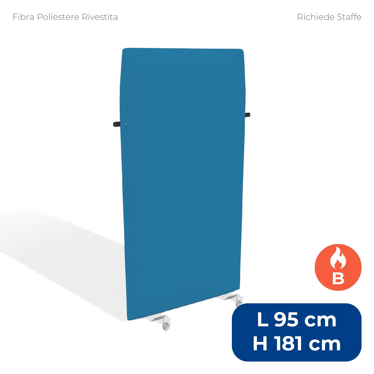 Pannello divisorio da pavimento ad alta capacità fonoassorbente, ideale per migliorare l'acustica e garantire privacy negli ambienti lavorativi o pubblici. Misura 95xH181 cm con uno spessore di 4 cm ed è dotato di una struttura interna in metallo e imbottitura in fibra di poliestere ignifuga (classe 1), ad alto assorbimento acustico. Il rivestimento sfoderabile in tessuto ignifugo (classe 1), nel colore ciano tipo "B", è completato da una pratica cinghietta con bottone automatico. Le staffe per il fissaggio a pavimento sono da acquistare separatamente.