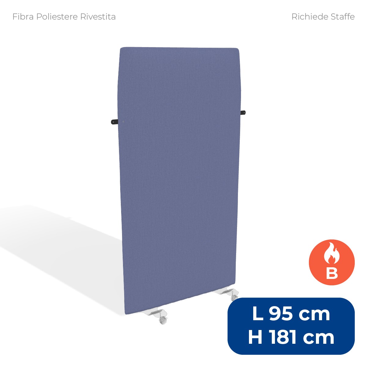 Pannello divisorio da pavimento ad alta capacità fonoassorbente, ideale per migliorare l'acustica e garantire privacy negli ambienti lavorativi o pubblici. Misura 95xH181 cm con uno spessore di 4 cm ed è dotato di una struttura interna in metallo e imbottitura in fibra di poliestere ignifuga (classe 1), ad alto assorbimento acustico. Il rivestimento sfoderabile in tessuto ignifugo (classe 1), nel colore lilla tipo "B", è completato da una pratica cinghietta con bottone automatico. Le staffe per il fissaggio a pavimento sono da acquistare separatamente.