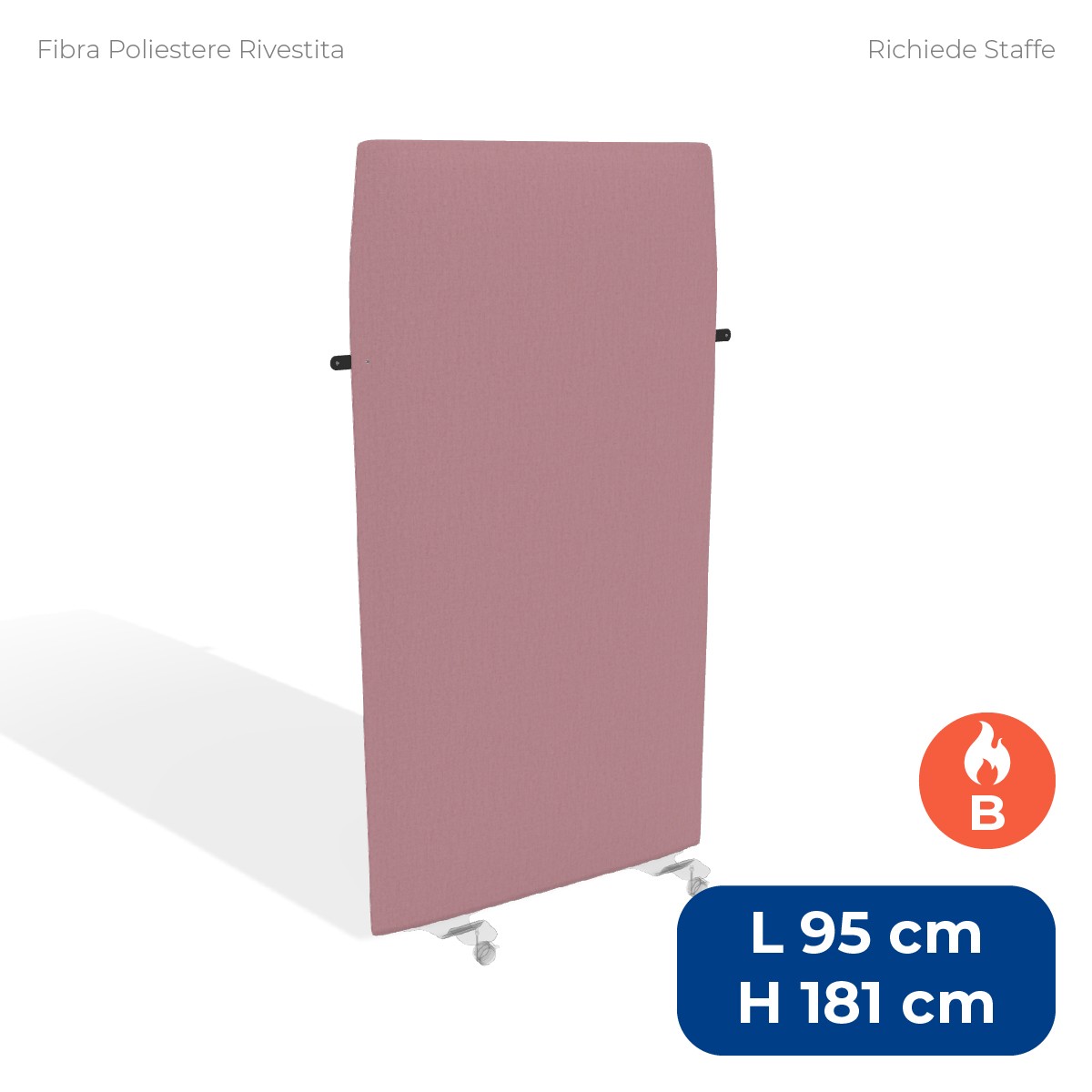 Pannello divisorio da pavimento ad alta capacità fonoassorbente, ideale per migliorare l'acustica e garantire privacy negli ambienti lavorativi o pubblici. Misura 95xH181 cm con uno spessore di 4 cm ed è dotato di una struttura interna in metallo e imbottitura in fibra di poliestere ignifuga (classe 1), ad alto assorbimento acustico. Il rivestimento sfoderabile in tessuto ignifugo (classe 1), nel colore rosa tipo "B", è completato da una pratica cinghietta con bottone automatico. Le staffe per il fissaggio a pavimento sono da acquistare separatamente.