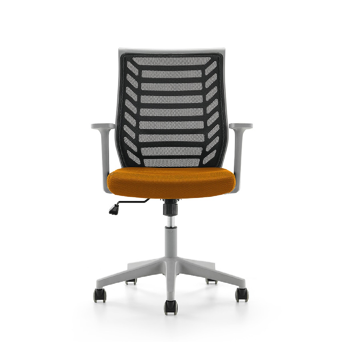Sedia da ufficio operativa con sedile rivestiti in tessuto ignifugo con interno in schiumato iniettato, schienale rivestito in rete su polimero tecnico iniettato. Base in polimero tecnico e robusto meccanismo basculante per l'uso quotidiano. Braccioli regolabili di serie. Facile montaggio. Colore scocca grigio, colore tessuto seduta arancio.