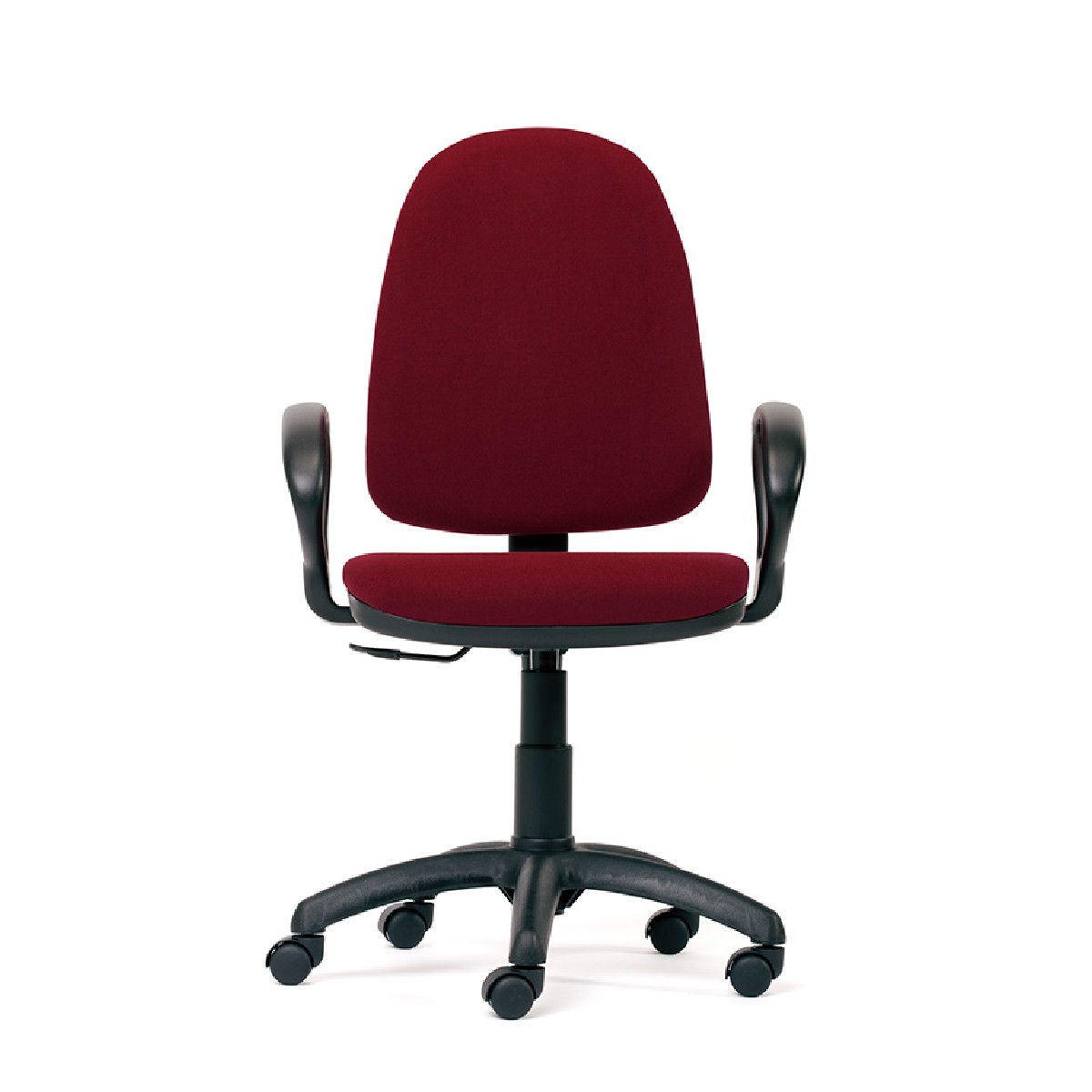 Sedia da ufficio operativa con alzata a gas. Sistema di inclinazione del sedile a contatto permanente. Schienale regolabile in altezza. Pomello per regolare l'inclinazione dello schienale in base al peso dell'utente. Rivestita in tessuto antincendio e resistente. Base in nylon con 5 razze per una maggiore stabilità. Consigliata per 8 ore di lavoro e un peso massimo di 100 kg. Compatibile con le ruote RD-917 per parquet. Facile montaggio. Colore bordeaux. Disponibile con braccioli.