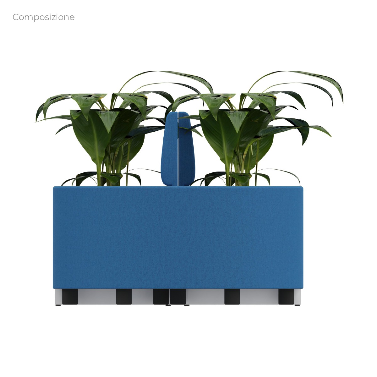 N. 2 pouf componibile di rettangolo stretto altezza M6 e schienale basso. Dimensioni: 48x51,5xH45,5cm, piedini alla base da 6cm, H da terra 74cm. N. 2 pouf componibile di forma semicerchio altezza M6. Dimensioni: dia96xH45,5cm con piedini da 6 cm. Materiale: rivestimento sfoderabile, tessuto ignifugo colore di tipo "A" blu chiaro, struttura in legno, imbottitura in gomma. N. 2 fioriere quadrate 45x45cm alta 41 cm in lamiera verniciata bianca, con piedini, sigillata, senza vaso.
