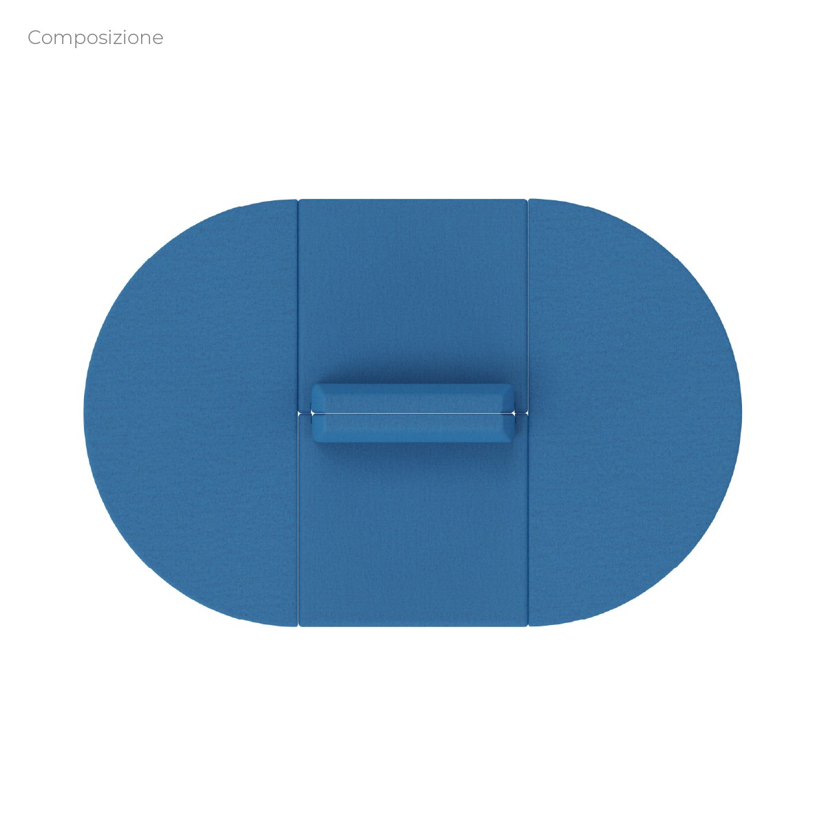 N. 2 pouf componibile di forma rettangolare stretta altezza M6 e schienale basso. Dimensioni: 48x51,5xH45,5cm, piedini alla base da 6cm, H da terra 74cm. N. 2 pouf componibile di forma semicerchio altezza M6. Dimensioni: dia96H45,5cm, piedini alla base da 6cm. Materiale: rivestimento sfoderabile, tessuto ignifugo colore di tipo "A" blu chiaro, struttura in legno, imbottitura in gomma.