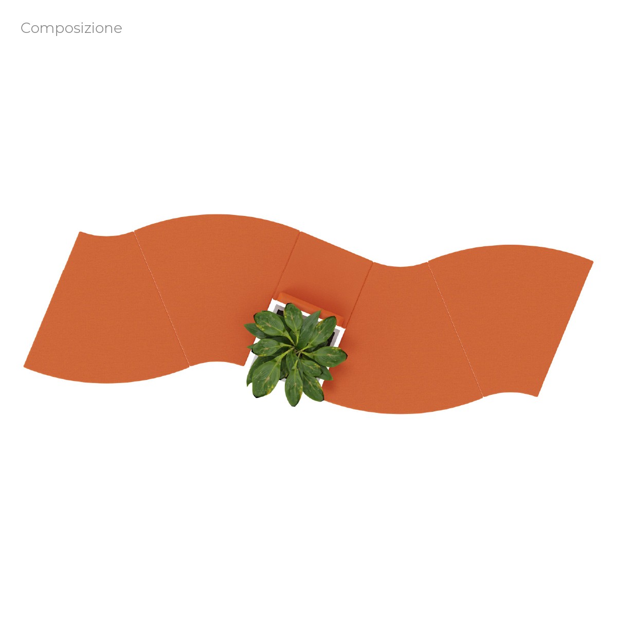 N. 4 pouf componibile di forma angolare doppia, altezza M6. Dimensioni: profondità 96cm H 45,5cm, piedini alla base da 6cm. N. 1 pouf componibile di forma rettangolare stretta con schienale basso, altezza M6. Dimensioni: 48x51,5xH45,5cm, piedini alla base da 6cm, H da terra 74cm. Materiale: rivestimento sfoderabile, tessuto ignifugo colore di tipo "A" arancione, struttura in legno, imbottitura in gomma. N. 1 fioriera quadrate 45x45cm alta 41 cm in lamiera verniciata bianca, con piedini, sigillata, senza vaso.