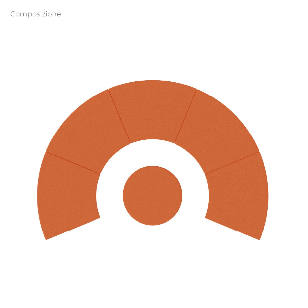 N. 5 pouf componibile di forma angolare stretta, altezza M6. Dimensioni: profondità 48cm H45,5cm, piedini alla base da 6cm, raggio esterno 95 cm. N. 1 pouf componibile di forma a cilindro, altezza M6. Dimensioni: diametro 48xH45,5cm, piedini alla base da 6cm. Materiale: rivestimento sfoderabile, tessuto ignifugo colore di tipo "A" arancione, struttura in legno, imbottitura in gomma.
