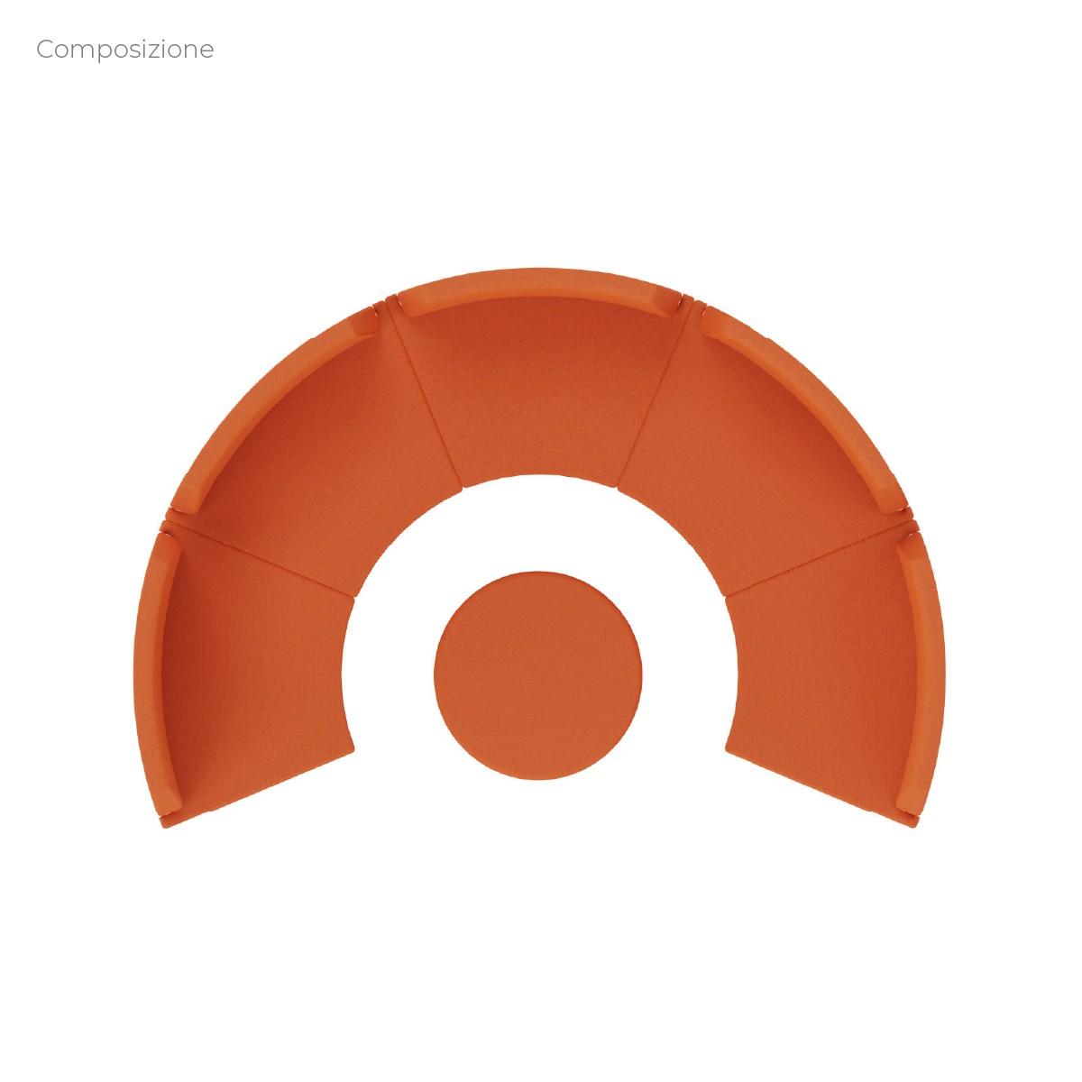 N. 5 pouf componibile di forma angolare stretta con schienale alto, altezza M6. Dimensioni: profondità 48cm H45,5cm, piedini alla base da 6cm, raggio esterno 95 cm, H da terra 109,5cm. N. 1 pouf componibile di forma a cilindro altezza M6. Dimensioni: diametro 48xH45,5cm, piedini alla base da 6cm. Materiale: rivestimento sfoderabile, tessuto ignifugo colore di tipo "A" arancione, struttura in legno, imbottitura in gomma. N.4 sistemi di aggancio per unione elementi pouf