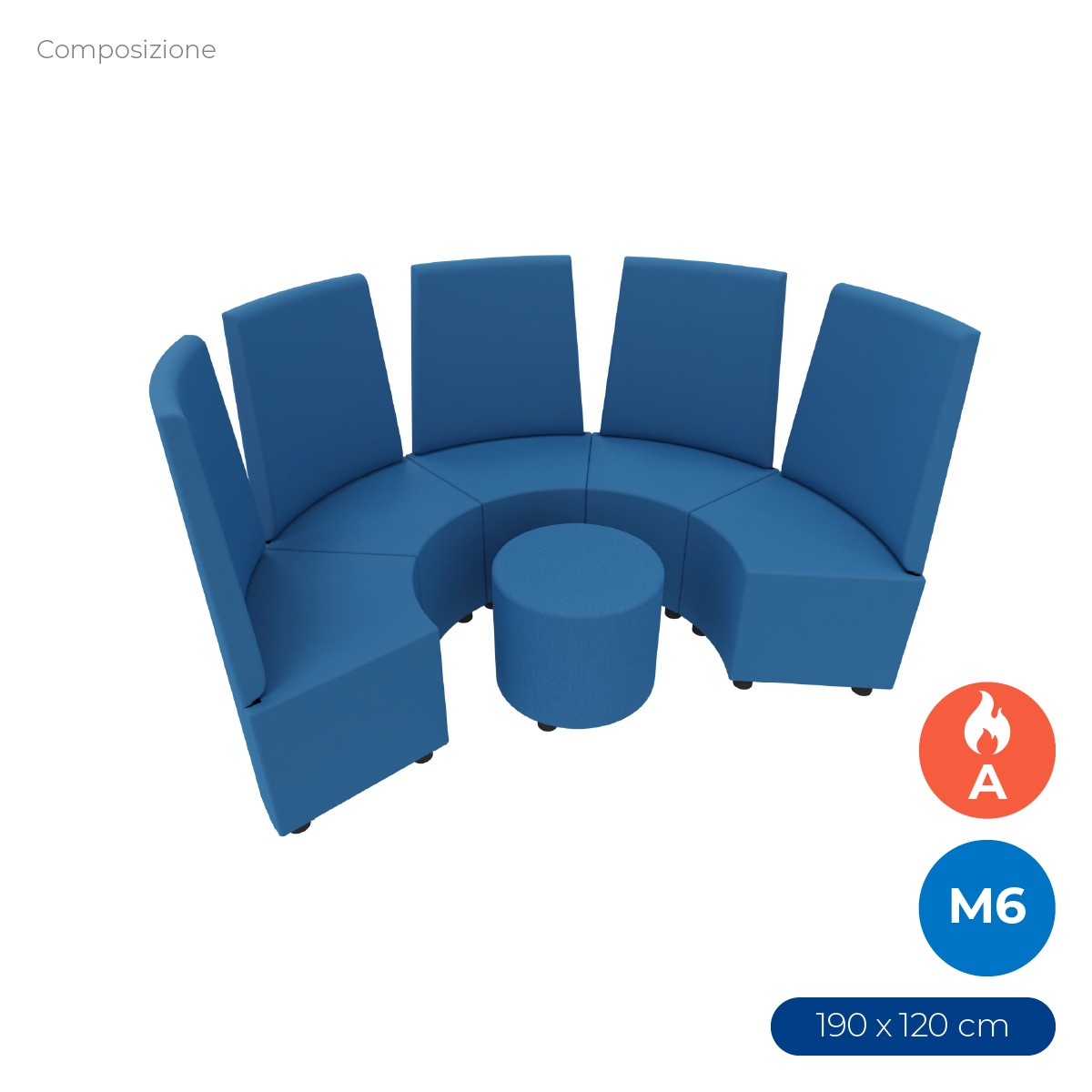 N. 5 pouf componibile di forma angolare stretta con schienale alto, altezza M6. Dimensioni: profondità 48cm H45,5cm, piedini alla base da 6cm, raggio esterno 95 cm, H da terra 109,5cm. N. 1 pouf componibile di forma a cilindro altezza M6. Dimensioni: diametro 48xH45,5cm, piedini alla base da 6cm. Materiale: rivestimento sfoderabile, tessuto ignifugo colore di tipo "A" blu chiaro, struttura in legno, imbottitura in gomma. N.4 sistemi di aggancio per unione elementi pouf