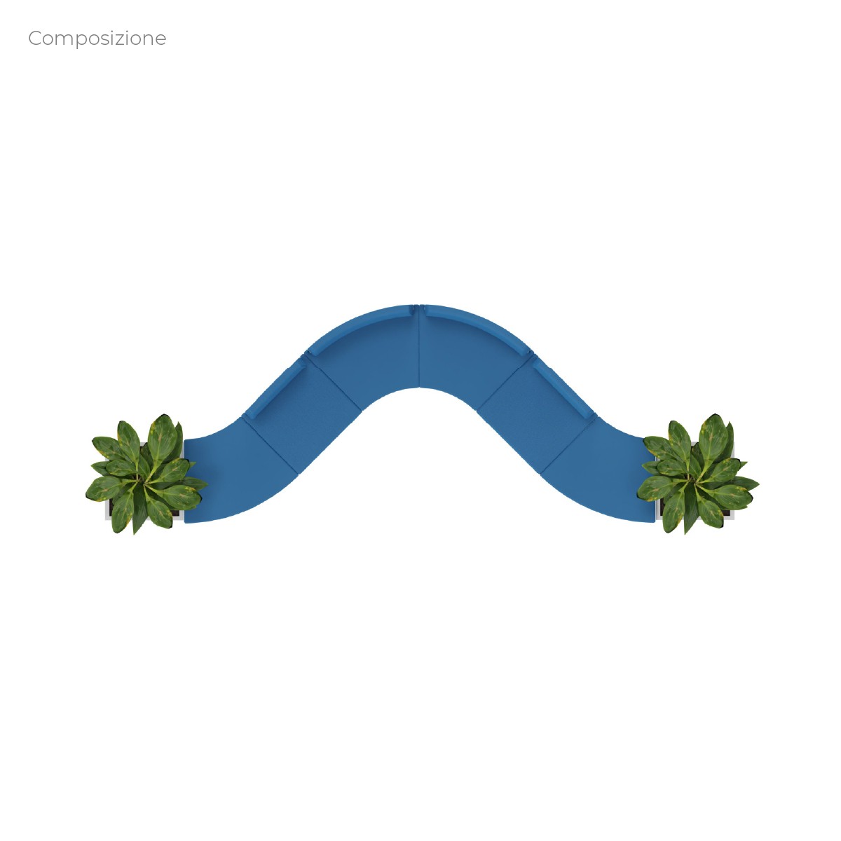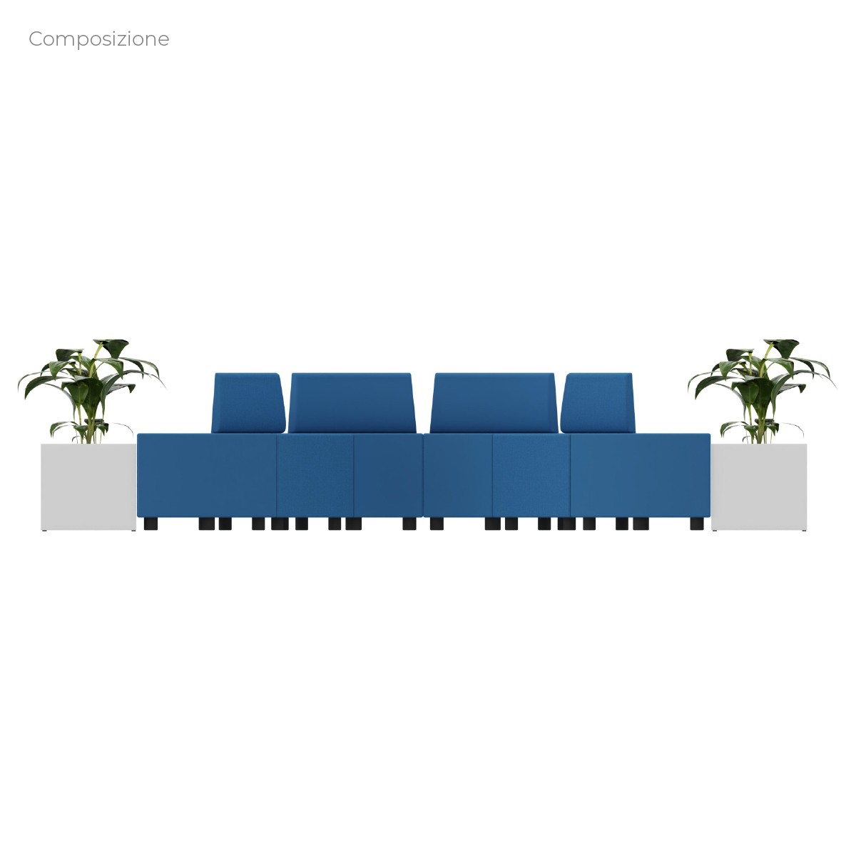 N. 2 pouf componibile di forma angolare stretta altezza M6. Dimensioni: profondità 48cm H45,5cm, piedini alla base da 6cm, raggio esterno 95 cm. N. 2 pouf componibile di forma angolare stretta con schienale basso, altezza M6. Dimensioni: profondità 48cm H45,5cm, piedini alla base da 6cm, raggio esterno 95 cm, H da terra 74cm. N.2 pouf rettangolo stretto con schienale basso, altezza M6. Dimensioni: 48x51,5xH45,5cm, piedini alla base da 6cm, H da terra 74cm. Materiale: rivestimento sfoderabile, tessuto ignifugo colore di tipo "A" blu chiaro, struttura in legno, imbottitura in gomma. N. 2 fioriere quadrate 45x45cm alta 41 cm in lamiera verniciata bianca, con piedini, sigillata, senza vaso.