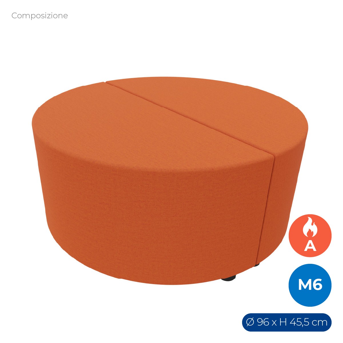 N. 2 pouf componibile di forma semicerchio altezza M6. Dimensioni: dia96xH45,5cm con piedini da 6 cm. Materiale: rivestimento sfoderabile, tessuto ignifugo colore di tipo "A" arancione, struttura in legno, imbottitura in gomma.