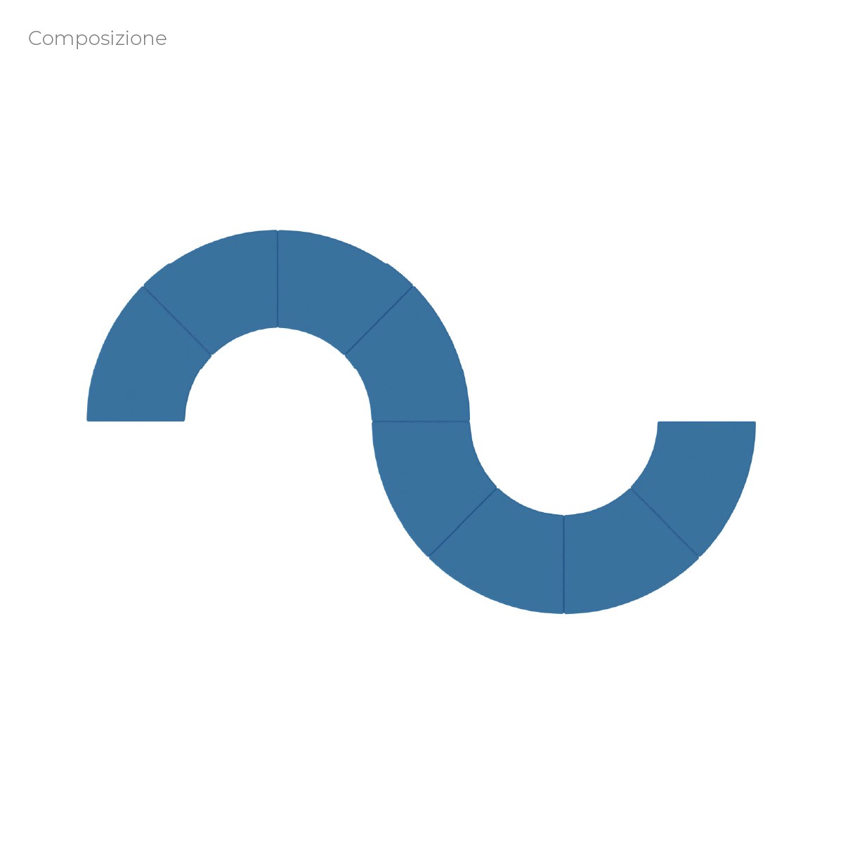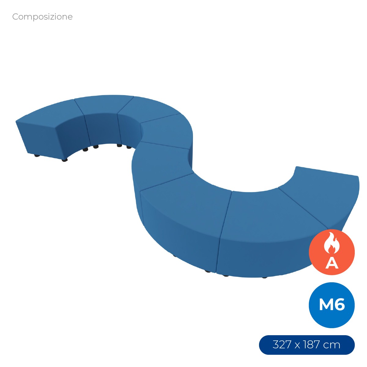 N. 8 pouf componibile di forma angolare stretta, altezza M6. Dimensioni: profondità 48cm H45,5cm, piedini alla base da 6cm, raggio esterno 95 cm. Materiale: rivestimento sfoderabile, tessuto ignifugo colore di tipo "A" blu chiaro, struttura in legno, imbottitura in gomma.