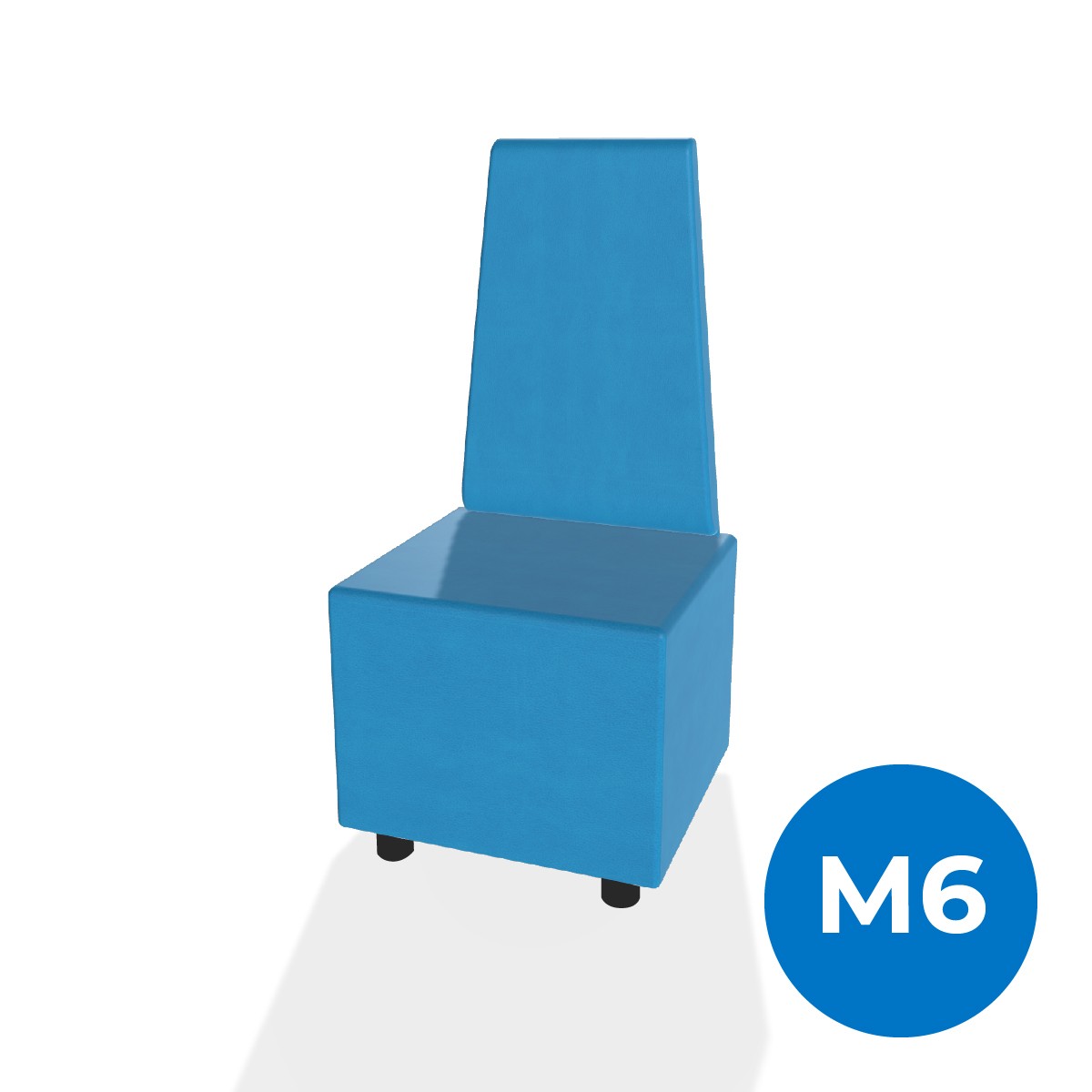 Pouf componibile di forma rettangolo stretto altezza M6 e schienale alto. Dimensioni: 48x51,5xH45,5cm, piedini alla base da 6cm, altezza da terra 109,5cm. Compatibile per sistema di aggancio unione elementi. Materiale: rivestimento sfoderabile, similpelle ignifuga classe 1 colore azzurro, struttura in legno, imbottitura in gomma. La caratteristica chiave di questa linea è la modularità assoluta. E’ possibile infatti creare illimitate combinazioni abbinando le diverse forme, al fine di dividere gli ambienti e arricchire gli spazi comuni. Prodotto pensato per gli spazi comuni quali atrii, corridoi ed altre aree di passaggio.