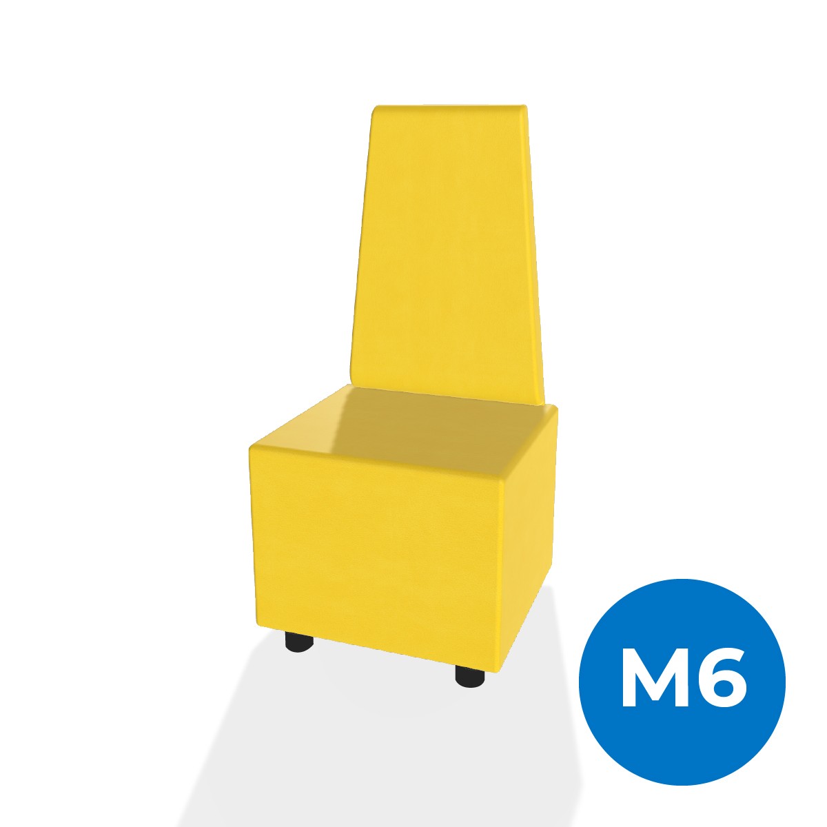 Pouf componibile di forma rettangolo stretto altezza M6 e schienale alto. Dimensioni: 48x51,5xH45,5cm, piedini alla base da 6cm, altezza da terra 109,5cm. Compatibile per sistema di aggancio unione elementi. Materiale: rivestimento sfoderabile, similpelle ignifuga classe 1 colore giallo, struttura in legno, imbottitura in gomma. La caratteristica chiave di questa linea è la modularità assoluta. E’ possibile infatti creare illimitate combinazioni abbinando le diverse forme, al fine di dividere gli ambienti e arricchire gli spazi comuni. Prodotto pensato per gli spazi comuni quali atrii, corridoi ed altre aree di passaggio.