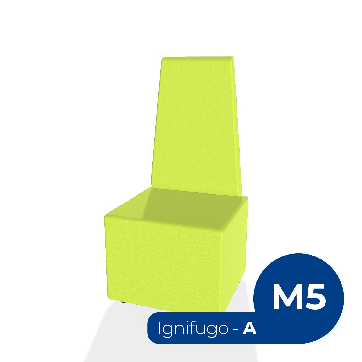 Pouf componibile di forma rettangolo stretto altezza M5 e schienale alto. Dimensioni: 48x51,5xH42cm, piedini alla base da 2,5 cm, altezza da terra 106cm. Compatibile per sistema di aggancio unione elementi. Materiale: rivestimento, sfoderabile, tessuto ignifugo colore di tipo "A" verde acido, struttura in legno, imbottitura in gomma. La caratteristica chiave di questa linea è la modularità assoluta. E’ possibile infatti creare illimitate combinazioni abbinando le diverse forme, al fine di dividere gli ambienti e arricchire gli spazi comuni. Prodotto pensato per gli spazi comuni quali atrii, corridoi ed altre aree di passaggio. Prodotto consegnato montato. (Richiede l'acquisto di altri Pouf e sistema di aggancio)