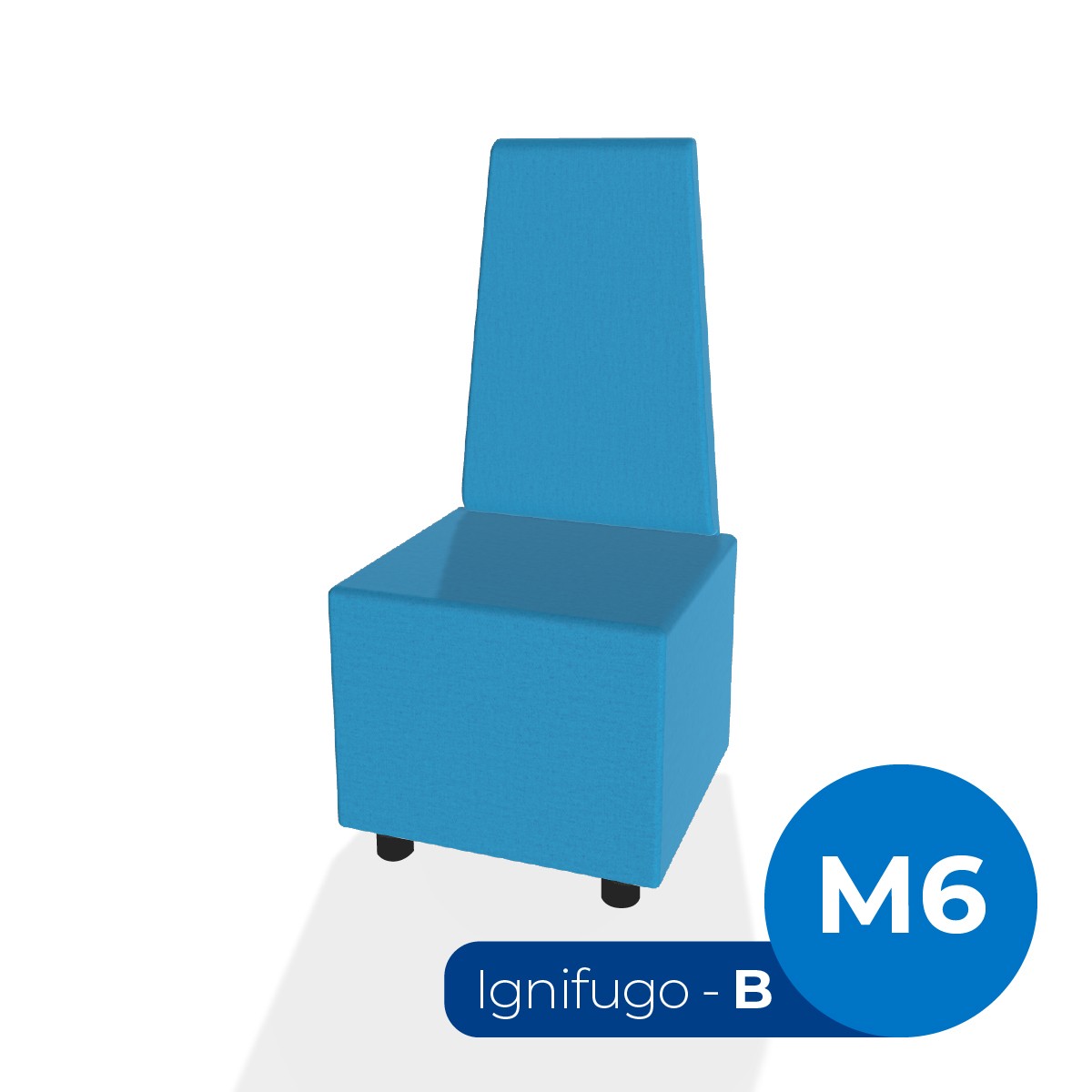 Pouf componibile di forma rettangolo stretto altezza M6 e schienale alto. Dimensioni: 48x51,5xH45,5cm, piedini alla base da 6cm, altezza schienale 109,5cm. Compatibile per sistema di aggancio unione elementi. Materiale: rivestimento sfoderabile, tessuto ignifugo colore di tipo "B" ciano, struttura in legno, imbottitura in gomma. La caratteristica chiave di questa linea è la modularità assoluta. E’ possibile infatti creare illimitate combinazioni abbinando le diverse forme, al fine di dividere gli ambienti e arricchire gli spazi comuni. Prodotto pensato per gli spazi comuni quali atrii, corridoi ed altre aree di passaggio. Prodotto consegnato montato. (Richiede l'acquisto di altri Pouf e sistema di aggancio)