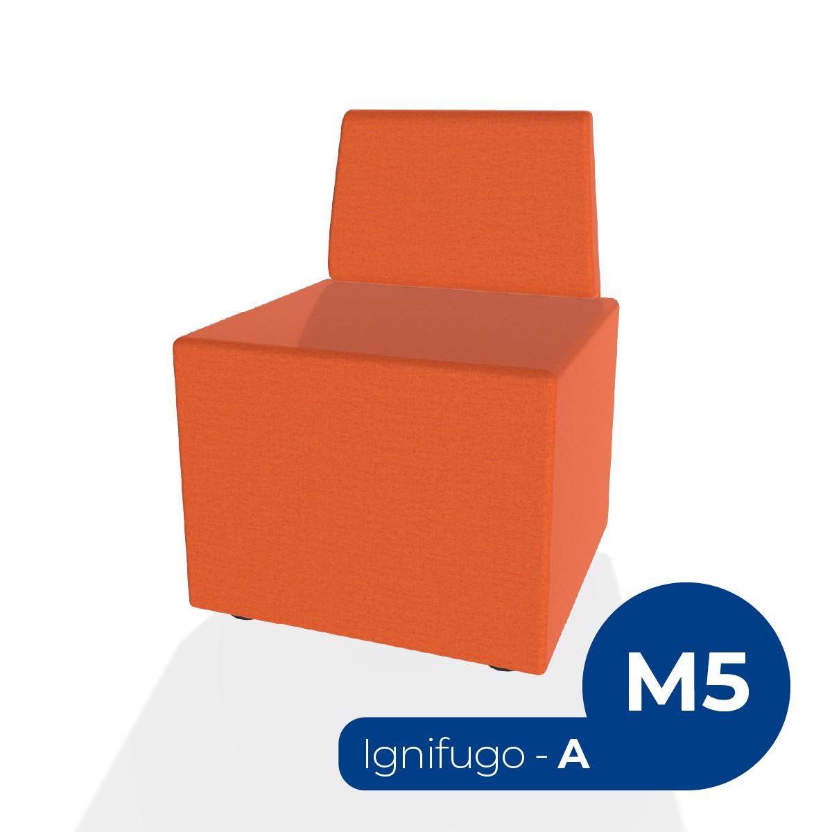 Pouf componibile di forma rettangolo stretto altezza M5 e schienale basso. Dimensioni: 48x51,5xH42cm, piedini alla base da 2,5 cm, altezza da terra 70,5cm. Compatibile per sistema di aggancio unione elementi. Materiale: rivestimento sfoderabile, tessuto ignifugo colore di tipo "A" arancione, struttura in legno, imbottitura in gomma. La caratteristica chiave di questa linea è la modularità assoluta. E’ possibile infatti creare illimitate combinazioni abbinando le diverse forme, al fine di dividere gli ambienti e arricchire gli spazi comuni. Prodotto pensato per gli spazi comuni quali atrii, corridoi ed altre aree di passaggio.