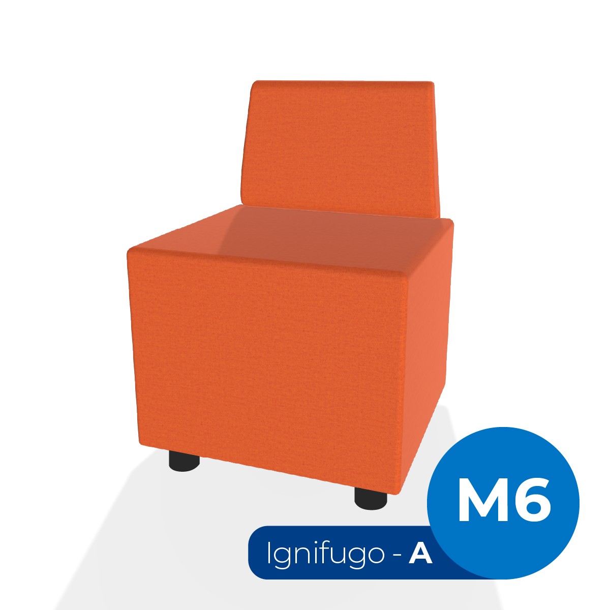 Pouf componibile di forma rettangolo stretto altezza M6 e schienale basso. Dimensioni: 48x51,5xH45,5cm, piedini alla base da 6cm, altezza schienale 74cm. Compatibile per sistema di aggancio unione elementi. Materiale: rivestimento sfoderabile, tessuto ignifugo colore di tipo "A" arancione, struttura in legno, imbottitura in gomma. La caratteristica chiave di questa linea è la modularità assoluta. E’ possibile infatti creare illimitate combinazioni abbinando le diverse forme, al fine di dividere gli ambienti e arricchire gli spazi comuni. Prodotto pensato per gli spazi comuni quali atrii, corridoi ed altre aree di passaggio.