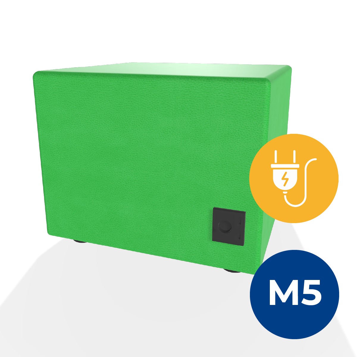 Pouf componibile di forma rettangolo stretto altezza M5, con una presa schuko e due prese usb - c. Dimensioni: 48x51,5xH42cm , piedini alla base da 2,5 cm. Compatibile per sistema di aggancio unione elementi. Materiale: rivestimento non sfoderabile, similpelle ignifuga classe 1 colore verde chiaro, struttura in legno, imbottitura in gomma. La caratteristica chiave di questa linea è la modularità assoluta. E’ possibile infatti creare illimitate combinazioni abbinando le diverse forme, al fine di dividere gli ambienti e arricchire gli spazi comuni. Prodotto pensato per gli spazi comuni quali atrii, corridoi ed altre aree di passaggio.