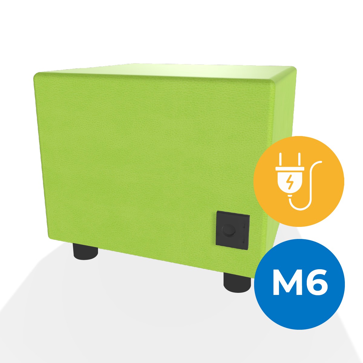 Pouf componibile di forma rettangolo stretto altezza M6, con una presa schuko e due prese usb - c. Dimensioni: 48x51,5xH45,5cm, piedini alla base da 6cm. Compatibile per sistema di aggancio unione elementi. Materiale: rivestimento non sfoderabile, similpelle ignifuga classe 1 colore verde chiaro, struttura in legno, imbottitura in gomma. La caratteristica chiave di questa linea è la modularità assoluta. E’ possibile infatti creare illimitate combinazioni abbinando le diverse forme, al fine di dividere gli ambienti e arricchire gli spazi comuni. Prodotto pensato per gli spazi comuni quali atrii, corridoi ed altre aree di passaggio.
