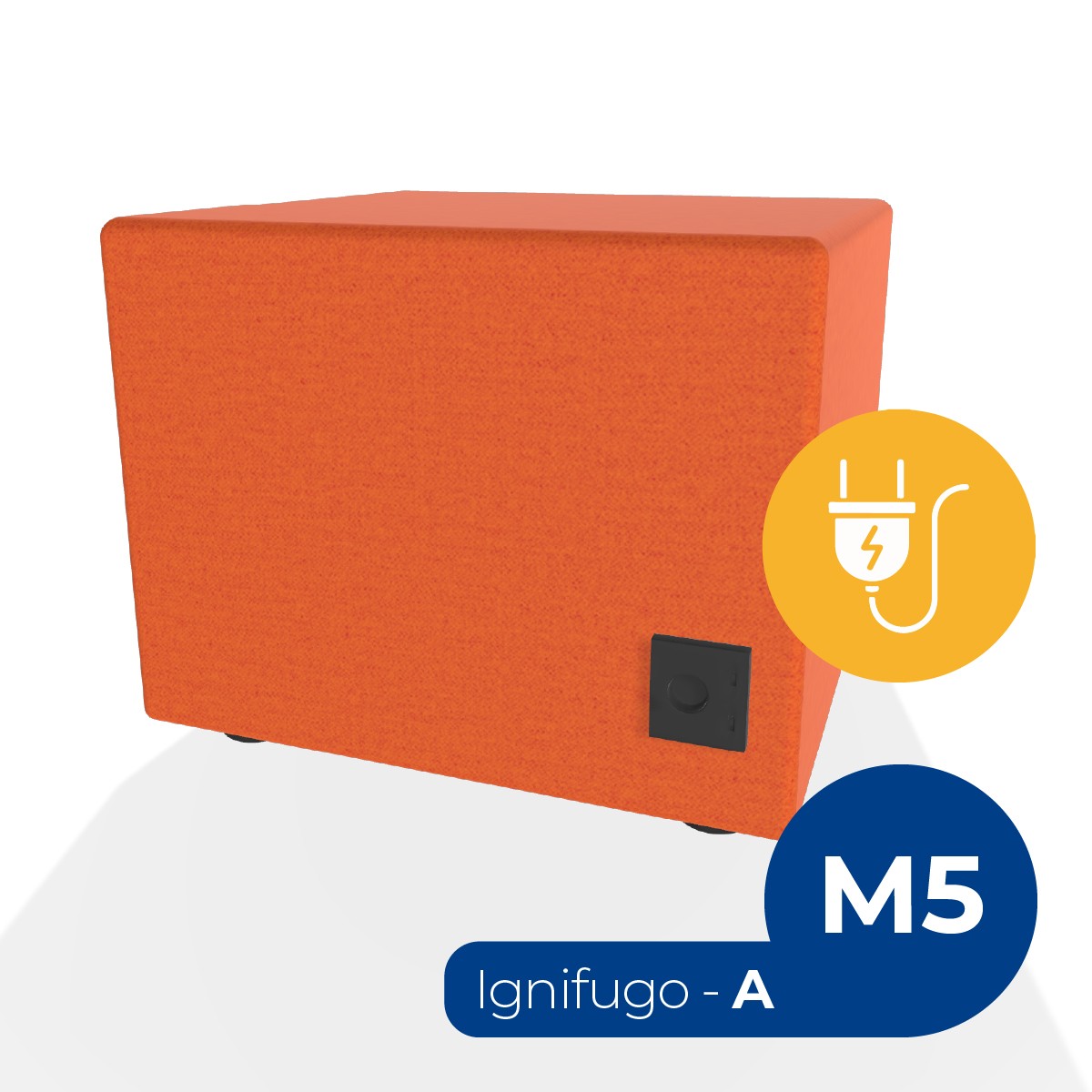 Pouf componibile di forma rettangolo stretto altezza M5, con una presa schuko e due prese usb - c. Dimensioni: 48x51,5xH42cm, piedini alla base da 2,5 cm. Compatibile per sistema di aggancio unione elementi. Materiale: rivestimento non sfoderabile, tessuto ignifugo colore di tipo "A" arancione, struttura in legno, imbottitura in gomma. La caratteristica chiave di questa linea è la modularità assoluta. E’ possibile infatti creare illimitate combinazioni abbinando le diverse forme, al fine di dividere gli ambienti e arricchire gli spazi comuni. Prodotto pensato per gli spazi comuni quali atrii, corridoi ed altre aree di passaggio.
