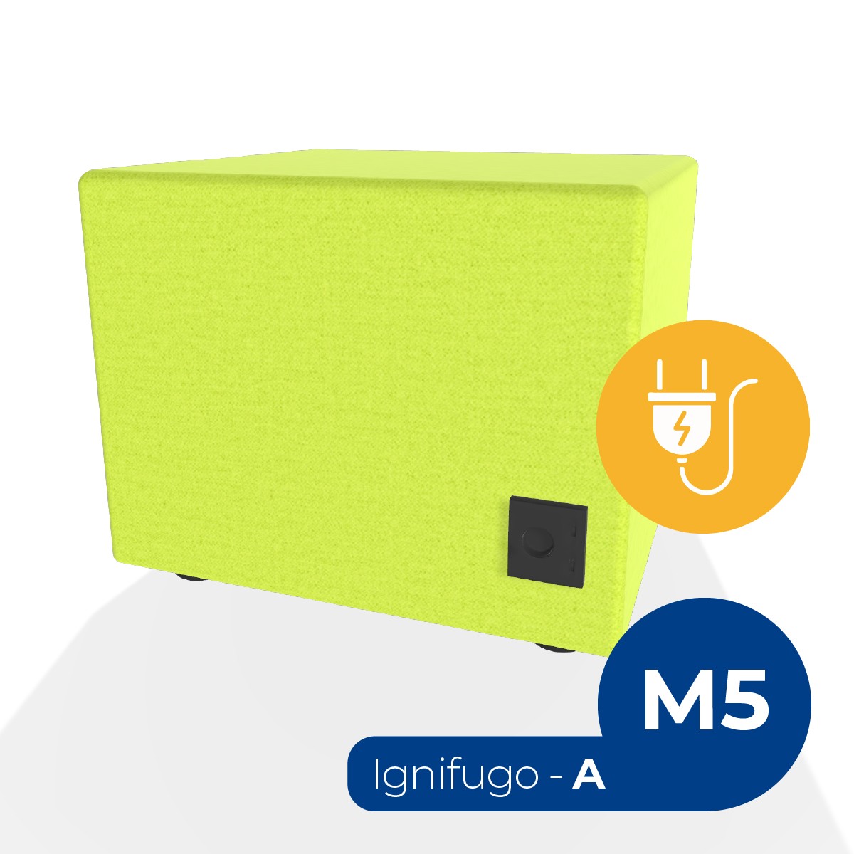 Pouf componibile di forma rettangolo stretto altezza M5, con una presa schuko e due prese usb - c. Dimensioni: 48x51,5xH42cm, piedini alla base da 2,5 cm. Compatibile per sistema di aggancio unione elementi. Materiale: rivestimento non sfoderabile, tessuto ignifugo colore di tipo "A" verde acido, struttura in legno, imbottitura in gomma. La caratteristica chiave di questa linea è la modularità assoluta. E’ possibile infatti creare illimitate combinazioni abbinando le diverse forme, al fine di dividere gli ambienti e arricchire gli spazi comuni. Prodotto pensato per gli spazi comuni quali atrii, corridoi ed altre aree di passaggio.