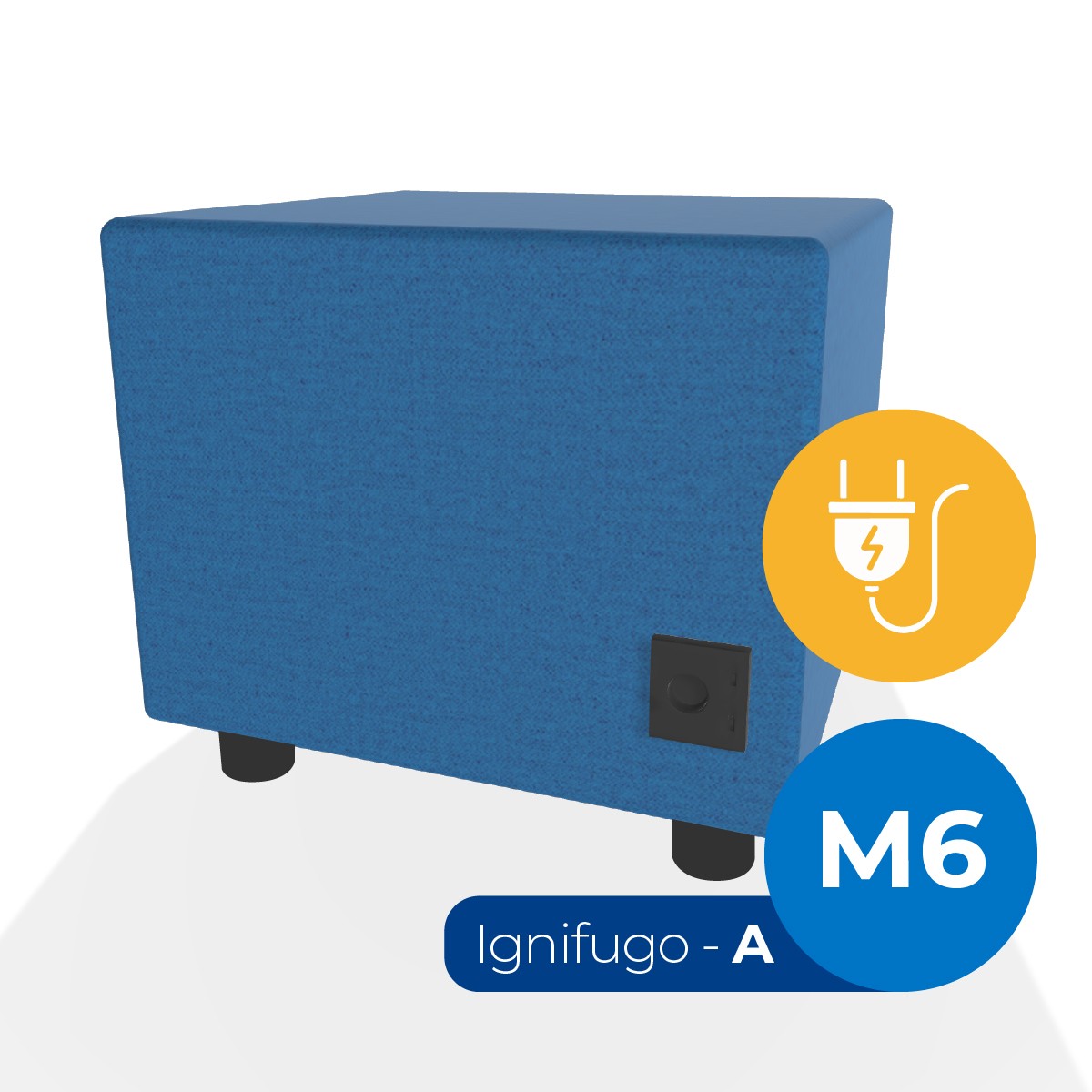 Pouf componibile di forma rettangolo stretto altezza M6, con una presa schuko e due prese usb - c. Dimensioni: 48x51,5xH45,5cm, piedini alla base da 6cm. Compatibile per sistema di aggancio unione elementi. Materiale: rivestimento non sfoderabile, tessuto ignifugo colore di tipo "A" blu chiaro, struttura in legno, imbottitura in gomma. La caratteristica chiave di questa linea è la modularità assoluta. E’ possibile infatti creare illimitate combinazioni abbinando le diverse forme, al fine di dividere gli ambienti e arricchire gli spazi comuni. Prodotto pensato per gli spazi comuni quali atrii, corridoi ed altre aree di passaggio.