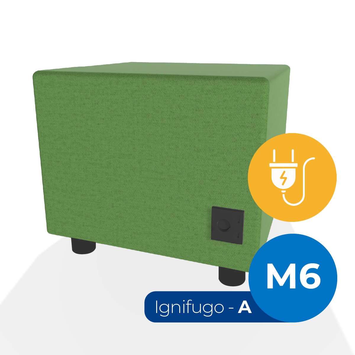 Pouf componibile di forma rettangolo stretto altezza M6, con una presa schuko e due prese usb - c. Dimensioni: 48x51,5xH45,5cm, piedini alla base da 6cm. Compatibile per sistema di aggancio unione elementi. Materiale: rivestimento non sfoderabile, tessuto ignifugo colore di tipo "A" verde, struttura in legno, imbottitura in gomma. La caratteristica chiave di questa linea è la modularità assoluta. E’ possibile infatti creare illimitate combinazioni abbinando le diverse forme, al fine di dividere gli ambienti e arricchire gli spazi comuni. Prodotto pensato per gli spazi comuni quali atrii, corridoi ed altre aree di passaggio.