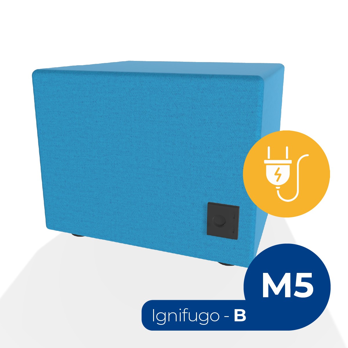 Pouf componibile di forma rettangolo stretto altezza M5, con una presa schuko e due prese usb - c. Dimensioni: 48x51,5xH42cm , piedini alla base da 2,5 cm. Compatibile per sistema di aggancio unione elementi. Materiale: rivestimento non sfoderabile, tessuto ignifugo colore di tipo "B" ciano, struttura in legno, imbottitura in gomma. La caratteristica chiave di questa linea è la modularità assoluta. E’ possibile infatti creare illimitate combinazioni abbinando le diverse forme, al fine di dividere gli ambienti e arricchire gli spazi comuni. Prodotto pensato per gli spazi comuni quali atrii, corridoi ed altre aree di passaggio.
