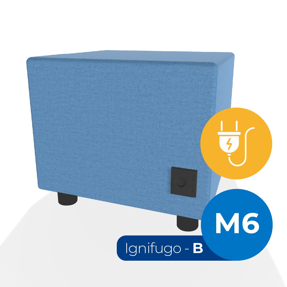 Pouf componibile di forma rettangolo stretto altezza M6, con una presa schuko e due prese usb - c. Dimensioni: 48x51,5xH45,5cm, piedini alla base da 6cm. Compatibile per sistema di aggancio unione elementi. Materiale: rivestimento non sfoderabile, tessuto ignifugo colore di tipo "B" azzurro avio, struttura in legno, imbottitura in gomma. La caratteristica chiave di questa linea è la modularità assoluta. E’ possibile infatti creare illimitate combinazioni abbinando le diverse forme, al fine di dividere gli ambienti e arricchire gli spazi comuni. Prodotto pensato per gli spazi comuni quali atrii, corridoi ed altre aree di passaggio.