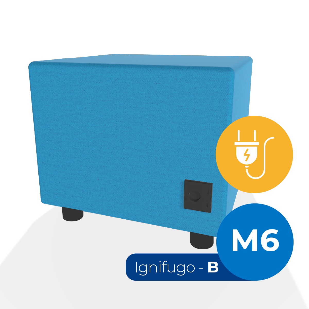 Pouf componibile di forma rettangolo stretto altezza M6, con una presa schuko e due prese usb - c. Dimensioni: 48x51,5xH45,5cm, piedini alla base da 6cm. Compatibile per sistema di aggancio unione elementi. Materiale: rivestimento non sfoderabile, tessuto ignifugo colore di tipo "B" ciano, struttura in legno, imbottitura in gomma. La caratteristica chiave di questa linea è la modularità assoluta. E’ possibile infatti creare illimitate combinazioni abbinando le diverse forme, al fine di dividere gli ambienti e arricchire gli spazi comuni. Prodotto pensato per gli spazi comuni quali atrii, corridoi ed altre aree di passaggio.