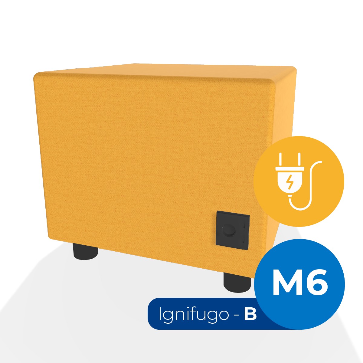 Pouf componibile di forma rettangolo stretto altezza M6, con una presa schuko e due prese usb - c. Dimensioni: 48x51,5xH45,5cm, piedini alla base da 6cm. Compatibile per sistema di aggancio unione elementi. Materiale: rivestimento non sfoderabile, tessuto ignifugo colore di tipo "B" giallo scuro, struttura in legno, imbottitura in gomma. La caratteristica chiave di questa linea è la modularità assoluta. E’ possibile infatti creare illimitate combinazioni abbinando le diverse forme, al fine di dividere gli ambienti e arricchire gli spazi comuni. Prodotto pensato per gli spazi comuni quali atrii, corridoi ed altre aree di passaggio.