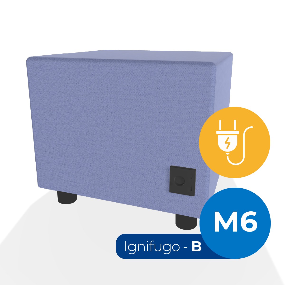 Pouf componibile di forma rettangolo stretto altezza M6, con una presa schuko e due prese usb - c. Dimensioni: 48x51,5xH45,5cm, piedini alla base da 6cm. Compatibile per sistema di aggancio unione elementi. Materiale: rivestimento non sfoderabile, tessuto ignifugo colore di tipo "B" lilla, struttura in legno, imbottitura in gomma. La caratteristica chiave di questa linea è la modularità assoluta. E’ possibile infatti creare illimitate combinazioni abbinando le diverse forme, al fine di dividere gli ambienti e arricchire gli spazi comuni. Prodotto pensato per gli spazi comuni quali atrii, corridoi ed altre aree di passaggio.