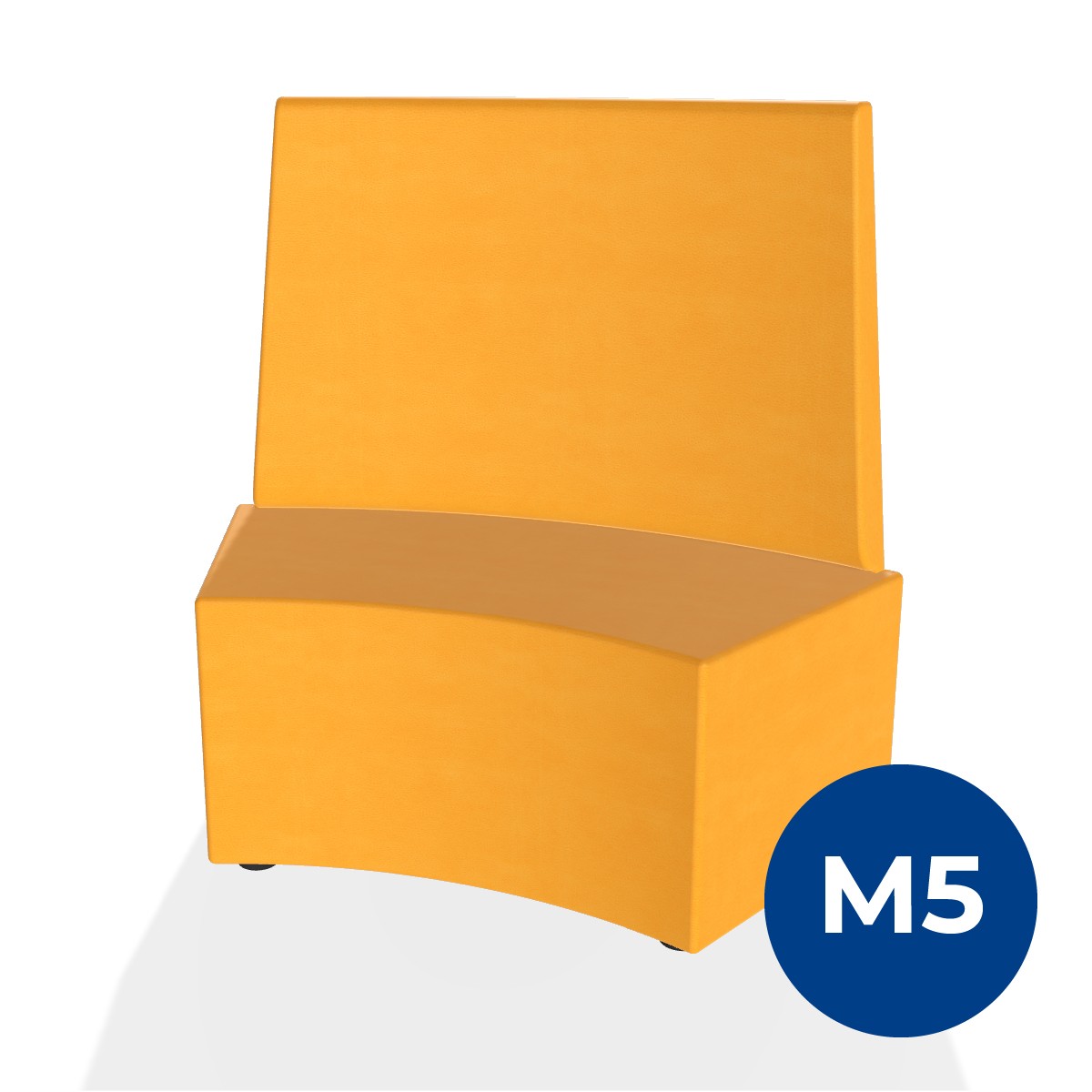 Pouf componibile di forma angolare altezza M5 e schienale alto. Dimensioni: profondità 48cm, raggio esterno 140cm,altezza da terra 106 cm, altezza seduta 42cm, piedini alla base da 2,5 cm. Compatibile per sistema di aggancio unione elementi. Materiale: rivestimento sfoderabile, similpelle ignifuga classe 1 colore arancione, struttura in legno, imbottitura in gomma. La caratteristica chiave di questa linea è la modularità assoluta. E’ possibile infatti creare illimitate combinazioni abbinando le diverse forme, al fine di dividere gli ambienti e arricchire gli spazi comuni.