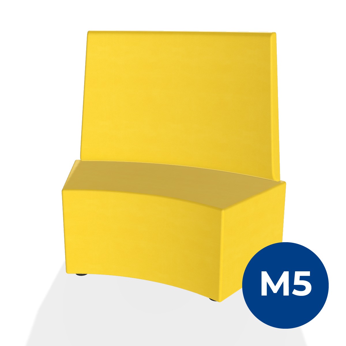 Pouf componibile di forma angolare altezza M5 e schienale alto. Dimensioni: profondità 48cm, raggio esterno 140cm,altezza da terra 106 cm, altezza seduta 42cm, piedini alla base da 2,5 cm. Compatibile per sistema di aggancio unione elementi. Materiale: rivestimento sfoderabile, similpelle ignifuga classe 1 colore giallo, struttura in legno, imbottitura in gomma. La caratteristica chiave di questa linea è la modularità assoluta. E’ possibile infatti creare illimitate combinazioni abbinando le diverse forme, al fine di dividere gli ambienti e arricchire gli spazi comuni. Prodotto pensato per gli spazi comuni quali atrii, corridoi ed altre aree di passaggio.