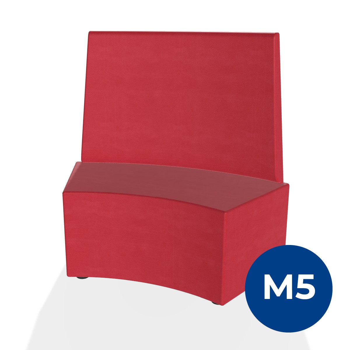 Pouf componibile di forma angolare altezza M5 e schienale alto. Dimensioni: profondità 48cm, raggio esterno 140cm, altezza da terra 106cm, altezza seduta 42cm, piedini alla base da 2,5 cm. Compatibile per sistema di aggancio unione elementi. Materiale: rivestimento sfoderabile, similpelle ignifuga classe 1 colore rosso, struttura in legno, imbottitura in gomma. La caratteristica chiave di questa linea è la modularità assoluta. E’ possibile infatti creare illimitate combinazioni abbinando le diverse forme, al fine di dividere gli ambienti e arricchire gli spazi comuni. Prodotto pensato per gli spazi comuni quali atrii, corridoi ed altre aree di passaggio.