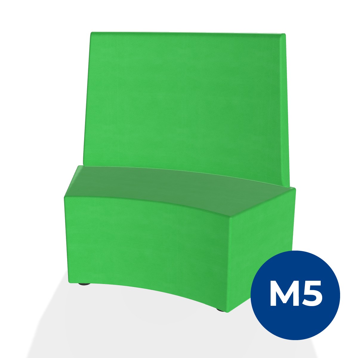Pouf componibile di forma angolare altezza M5 e schienale alto. Dimensioni: profondità 48cm, raggio esterno 140cm,altezza da terra 106 cm, altezza seduta 42cm, piedini alla base da 2,5 cm. Compatibile per sistema di aggancio unione elementi. Materiale: rivestimento sfoderabile, similpelle ignifuga classe 1 colore verde chiaro, struttura in legno, imbottitura in gomma. La caratteristica chiave di questa linea è la modularità assoluta. E’ possibile infatti creare illimitate combinazioni abbinando le diverse forme, al fine di dividere gli ambienti e arricchire gli spazi comuni. Prodotto pensato per gli spazi comuni quali atrii, corridoi ed altre aree di passaggio.