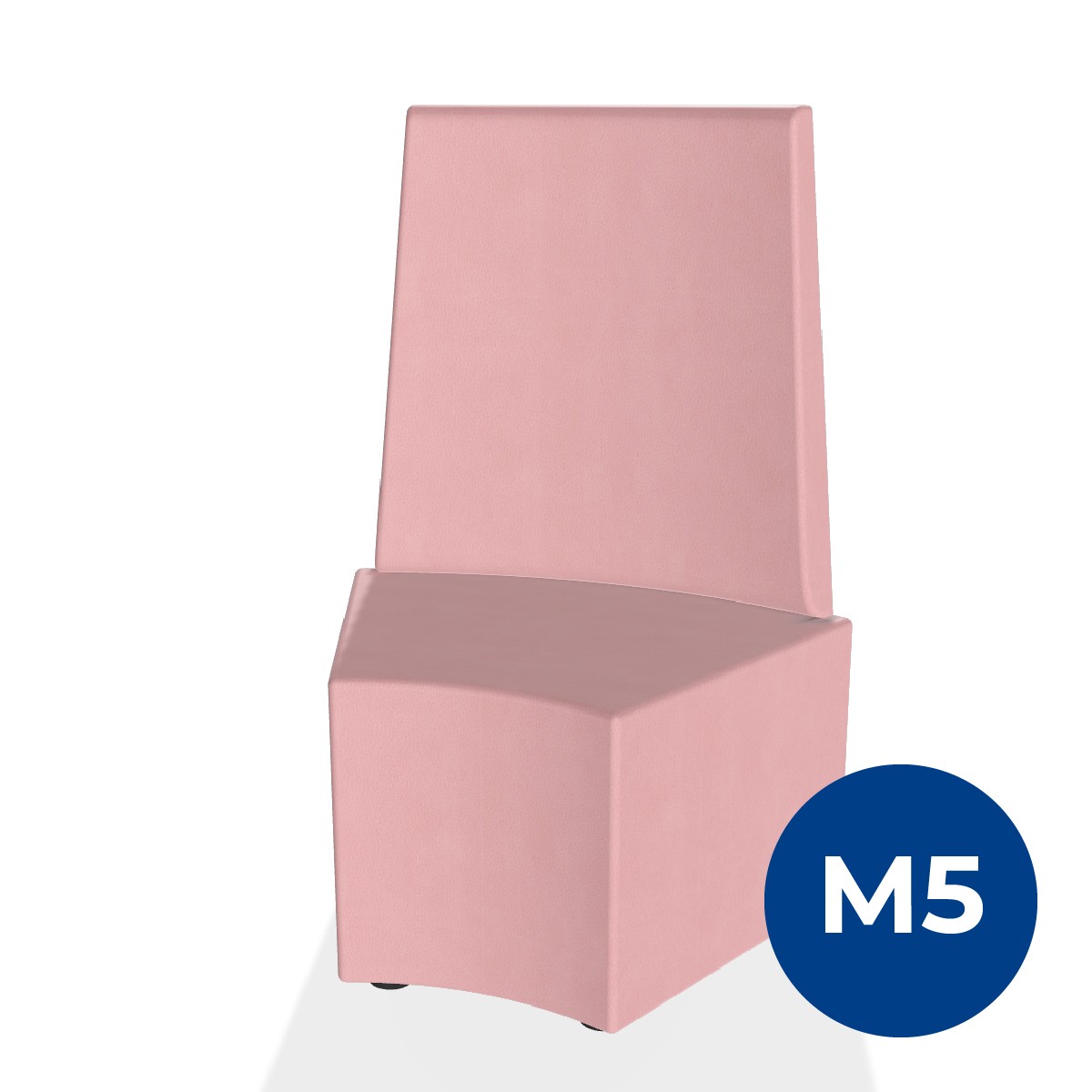 Pouf componibile di forma angolare altezza M5 e schienale alto. Dimensioni: profondità 48cm, raggio esterno 95cm, altezza da terra 106cm, altezza seduta 42cm, piedini alla base da 2,5 cm. Compatibile per sistema di aggancio unione elementi. Materiale: rivestimento sfoderabile, similpelle ignifuga classe 1 colore rosa, struttura in legno, imbottitura in gomma. La caratteristica chiave di questa linea è la modularità assoluta. E’ possibile infatti creare illimitate combinazioni abbinando le diverse forme, al fine di dividere gli ambienti e arricchire gli spazi comuni. Prodotto pensato per gli spazi comuni quali atrii, corridoi ed altre aree di passaggio.