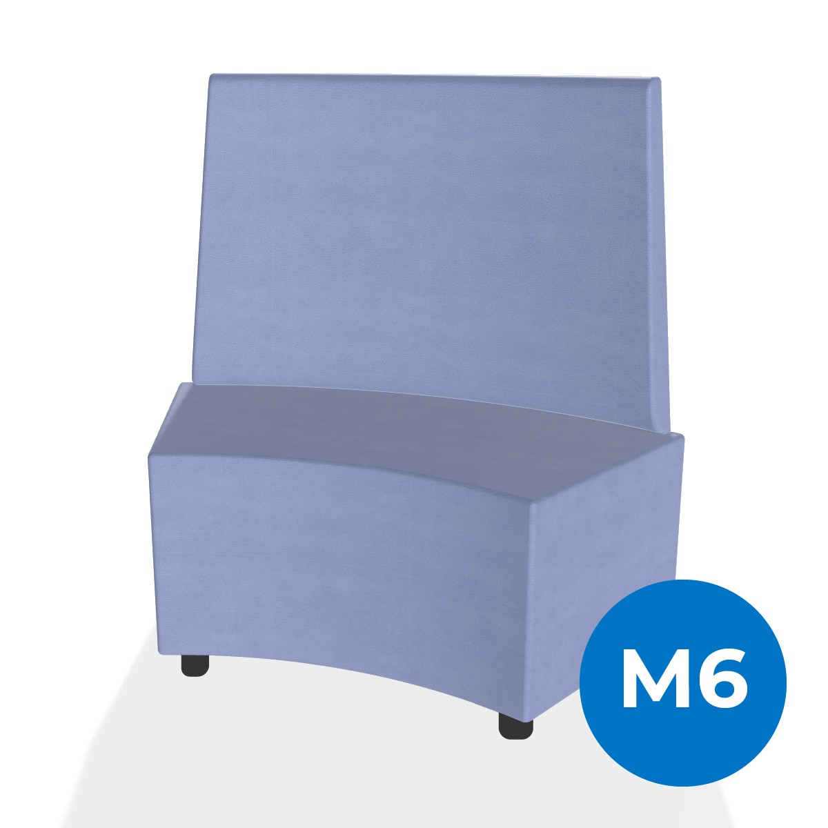 Pouf componibile di forma angolare altezza M6 e schienale alto. Dimensioni: profondità 48cm, raggio esterno 140cm, altezza da terra 109,5cm, altezza seduta 45,5cm, piedini alla base da 6 cm. Compatibile per sistema di aggancio unione elementi. Materiale: rivestimento sfoderabile, similpelle ignifuga classe 1 colore lilla, struttura in legno, imbottitura in gomma. La caratteristica chiave di questa linea è la modularità assoluta. E’ possibile infatti creare illimitate combinazioni abbinando le diverse forme, al fine di dividere gli ambienti e arricchire gli spazi comuni. Prodotto pensato per gli spazi comuni quali atrii, corridoi ed altre aree di passaggio.