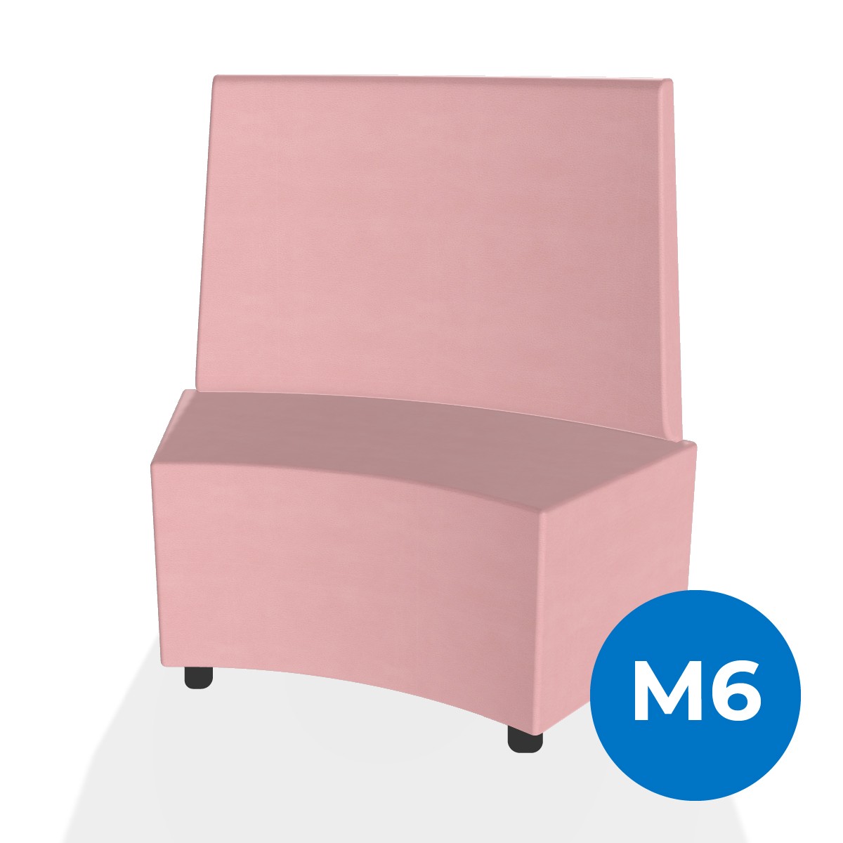Pouf componibile di forma angolare altezza M6 e schienale alto. Dimensioni: profondità 48cm, raggio esterno 140cm, altezza da terra 109,5cm, altezza seduta 45,5cm, piedini alla base da 6 cm. Compatibile per sistema di aggancio unione elementi. Materiale: rivestimento sfoderabile, similpelle ignifuga classe 1 colore rosa, struttura in legno, imbottitura in gomma. La caratteristica chiave di questa linea è la modularità assoluta. E’ possibile infatti creare illimitate combinazioni abbinando le diverse forme, al fine di dividere gli ambienti e arricchire gli spazi comuni. Prodotto pensato per gli spazi comuni quali atrii, corridoi ed altre aree di passaggio.