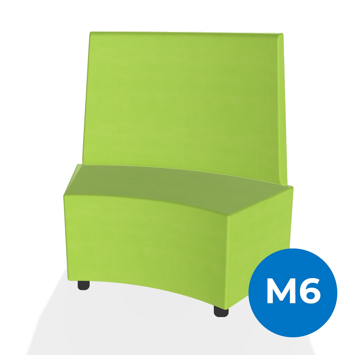 Pouf componibile di forma angolare altezza M6 e schienale alto. Dimensioni: profondità 48cm, raggio esterno 140cm, altezza da terra 109,5cm, altezza seduta 45,5cm, piedini alla base da 6 cm. Compatibile per sistema di aggancio unione elementi. Materiale: rivestimento sfoderabile, similpelle ignifuga classe 1 colore verde, struttura in legno, imbottitura in gomma. La caratteristica chiave di questa linea è la modularità assoluta. E’ possibile infatti creare illimitate combinazioni abbinando le diverse forme, al fine di dividere gli ambienti e arricchire gli spazi comuni. Prodotto pensato per gli spazi comuni quali atrii, corridoi ed altre aree di passaggio.