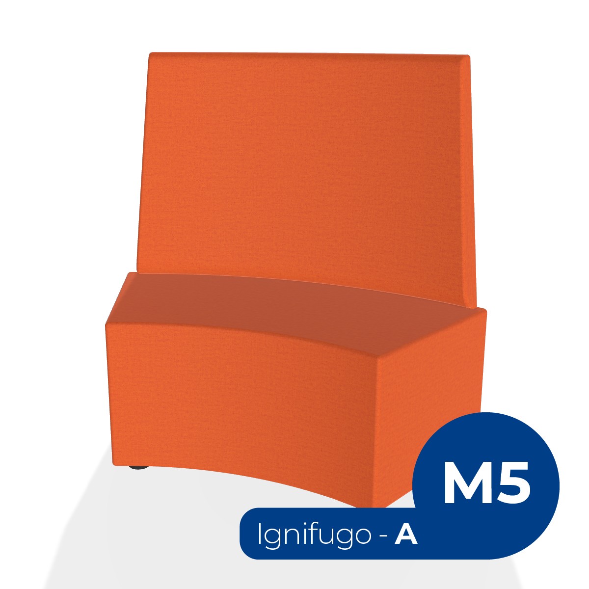 Pouf componibile di forma angolare altezza M5 e schienale alto. Dimensioni: profondità 48cm, raggio esterno 140cm, altezza da terra 106cm, altezza seduta 42cm, piedini alla base da 2,5 cm. Compatibile per sistema di aggancio unione elementi. Materiale: rivestimento sfoderabile, tessuto ignifugo colore di tipo "A" arancione, struttura in legno, imbottitura in gomma. La caratteristica chiave di questa linea è la modularità assoluta. E’ possibile infatti creare illimitate combinazioni abbinando le diverse forme, al fine di dividere gli ambienti e arricchire gli spazi comuni. Prodotto pensato per gli spazi comuni quali atrii, corridoi ed altre aree di passaggio.