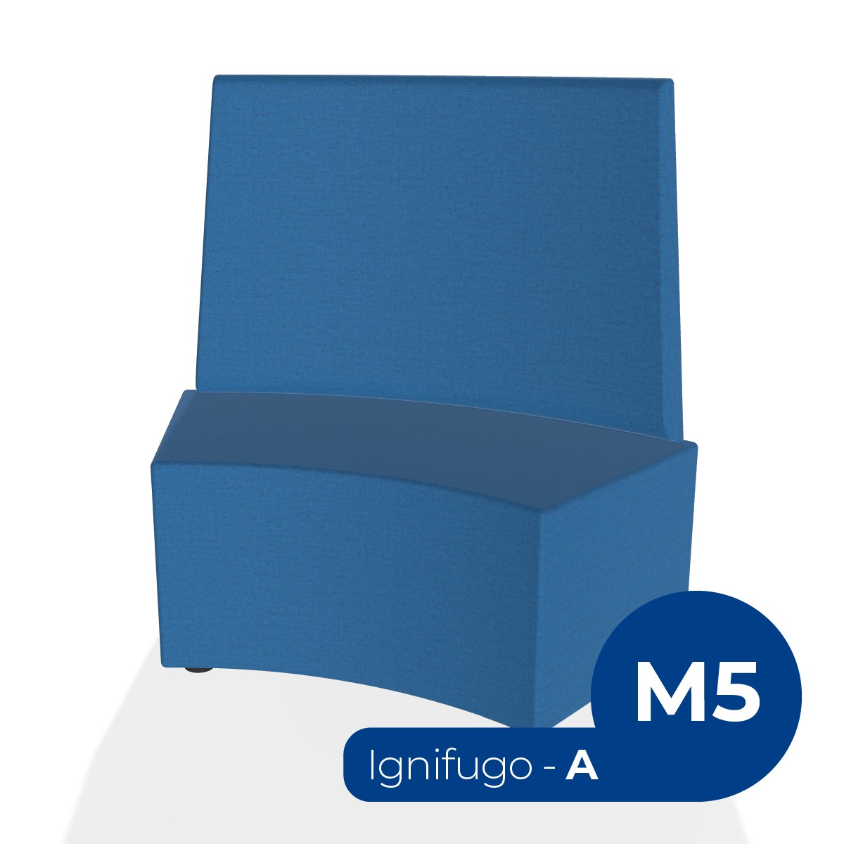 Pouf componibile di forma angolare altezza M5 e schienale alto. Dimensioni: profondità 48cm, raggio esterno 140cm, altezza da terra 106cm, altezza seduta 42cm, piedini alla base da 2,5 cm. Compatibile per sistema di aggancio unione elementi. Materiale: rivestimento sfoderabile, tessuto ignifugo colore di tipo "A" blu chiaro, struttura in legno, imbottitura in gomma. La caratteristica chiave di questa linea è la modularità assoluta. E’ possibile infatti creare illimitate combinazioni abbinando le diverse forme, al fine di dividere gli ambienti e arricchire gli spazi comuni. Prodotto pensato per gli spazi comuni quali atrii, corridoi ed altre aree di passaggio.