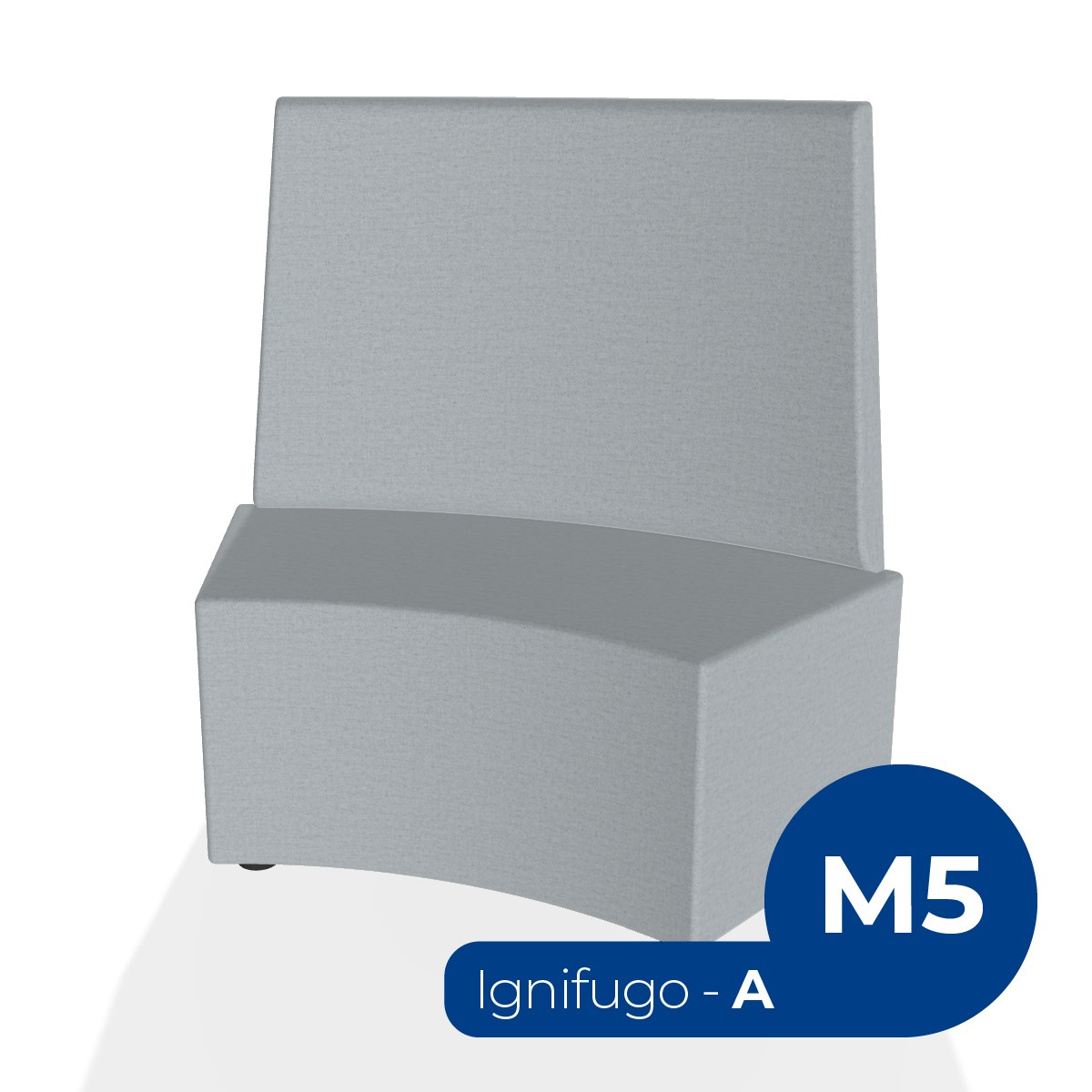Pouf componibile di forma angolare altezza M5 e schienale alto. Dimensioni: profondità 48cm, raggio esterno 140cm, altezza da terra 106cm, altezza seduta 42cm, piedini alla base da 2,5 cm. Compatibile per sistema di aggancio unione elementi. Materiale: rivestimento sfoderabile, tessuto ignifugo colore di tipo "A" grigio, struttura in legno, imbottitura in gomma. La caratteristica chiave di questa linea è la modularità assoluta. E’ possibile infatti creare illimitate combinazioni abbinando le diverse forme, al fine di dividere gli ambienti e arricchire gli spazi comuni. Prodotto pensato per gli spazi comuni quali atrii, corridoi ed altre aree di passaggio.