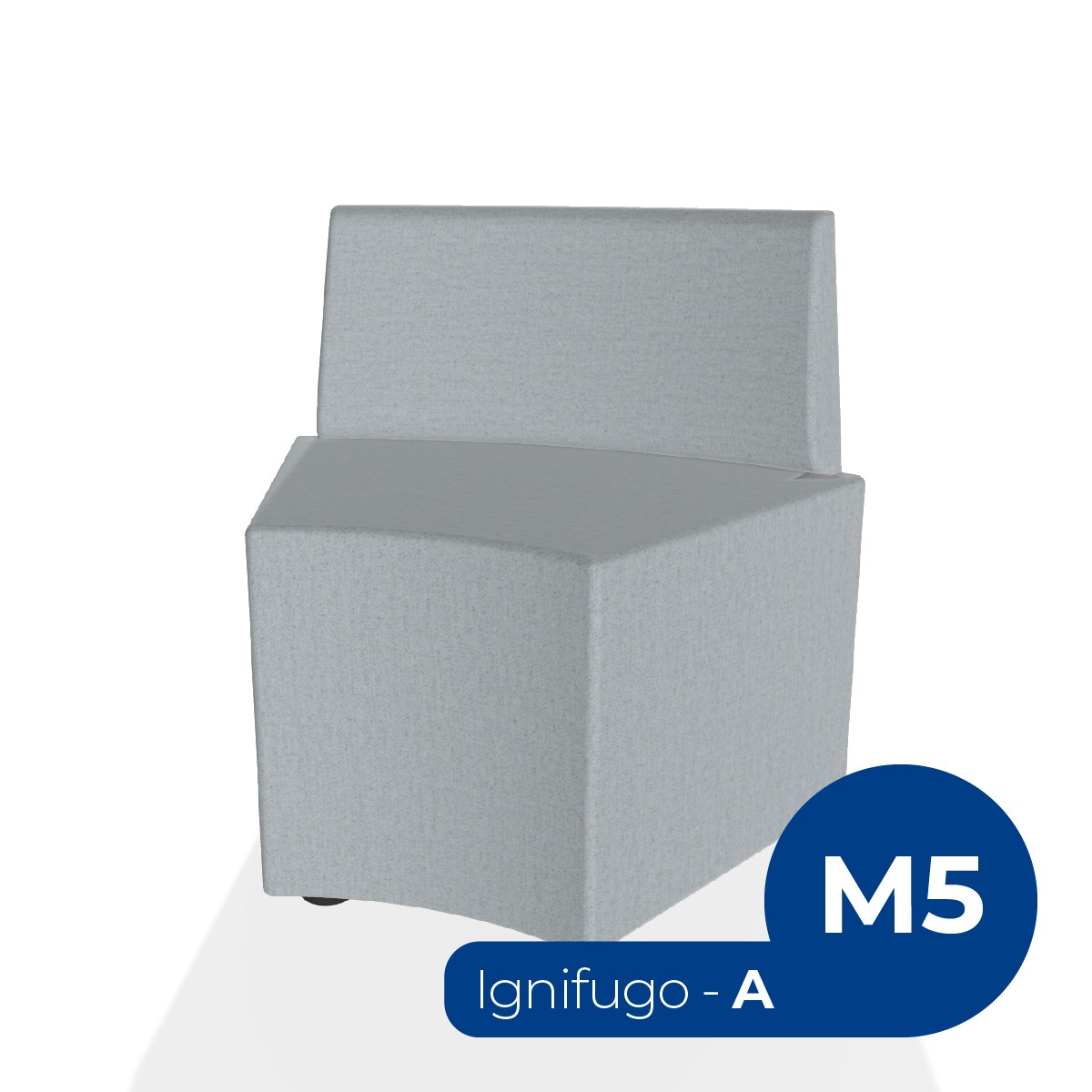 Pouf componibile di forma angolare altezza M5 e schienale basso. Dimensioni: profondità 48cm, raggio esterno 95cm, altezza da terra 70,5 cm, altezza seduta 42cm, piedini alla base da 2,5 cm. Compatibile per sistema di aggancio unione elementi. Materiale: rivestimento sfoderabile, tessuto ignifugo colore di tipo "A" grigio, struttura in legno, imbottitura in gomma. La caratteristica chiave di questa linea è la modularità assoluta. E’ possibile infatti creare illimitate combinazioni abbinando le diverse forme, al fine di dividere gli ambienti e arricchire gli spazi comuni. Prodotto pensato per gli spazi comuni quali atrii, corridoi ed altre aree di passaggio.